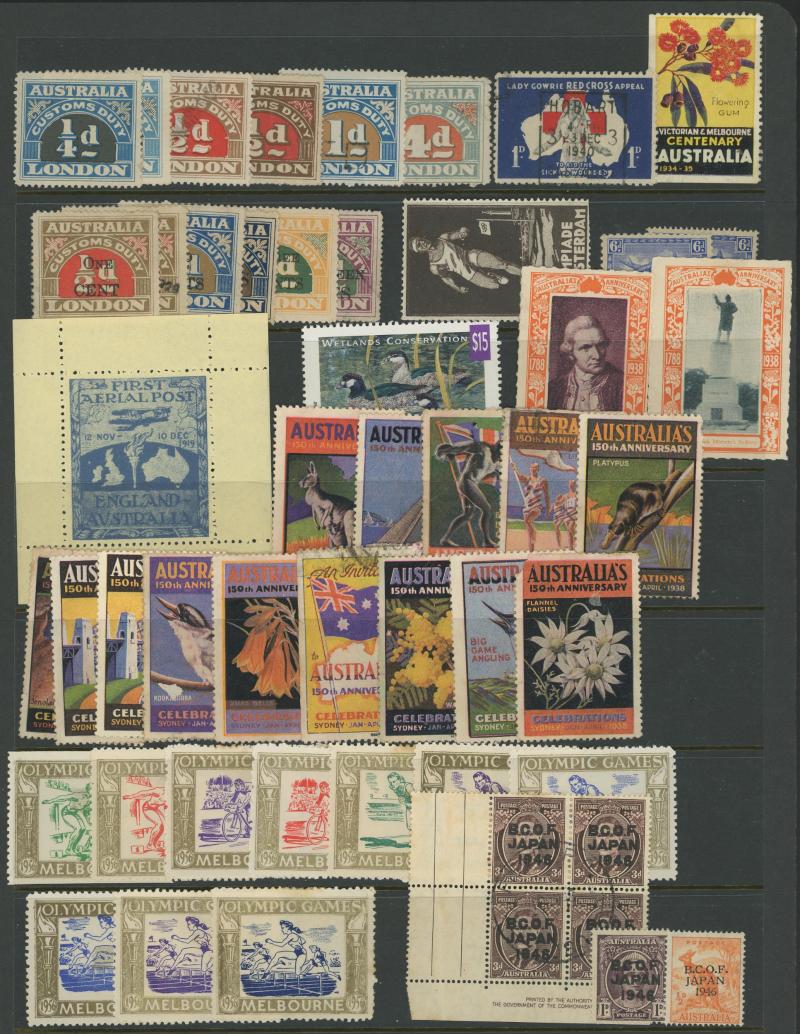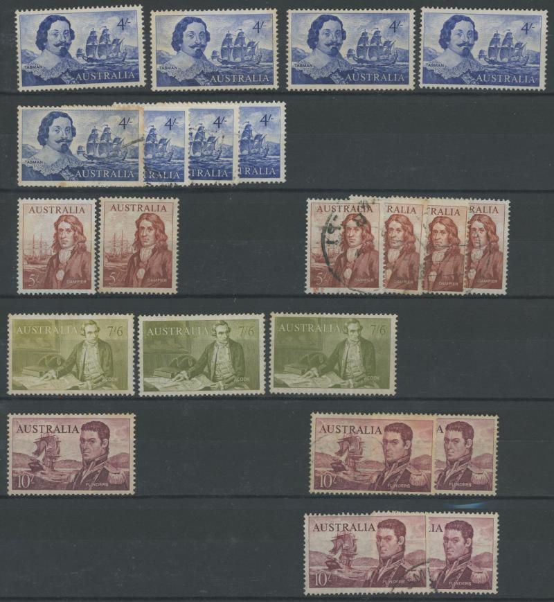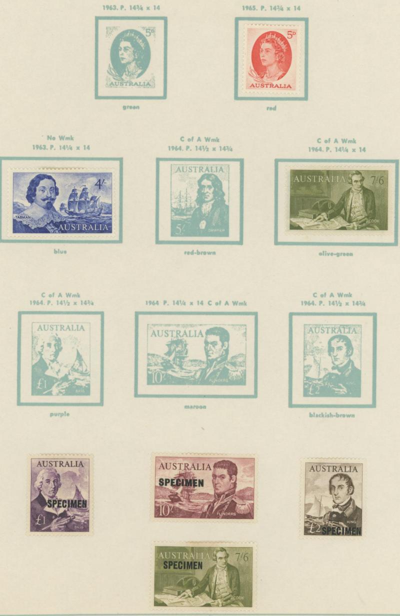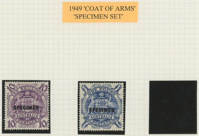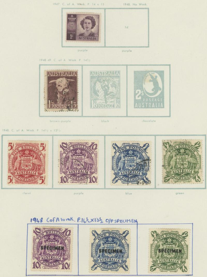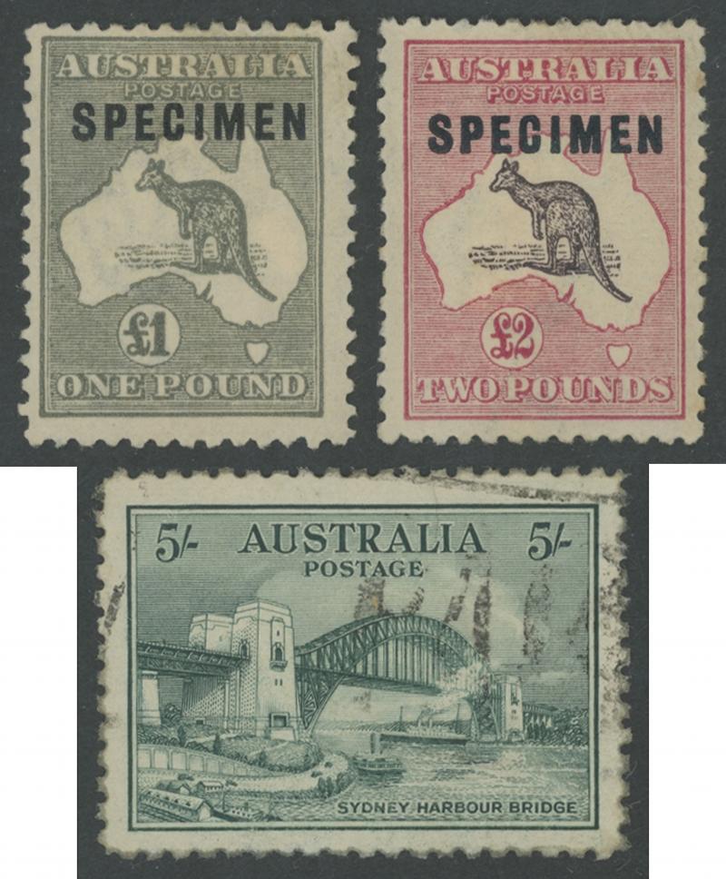 shades, 1914 6d Kookaburra *, 1932 5/- Harbour Bridge *, 1/- Lyrebird *, 1948 Arms used and 'SPECIMEN' set, 1964 Navigators 'SPECIMEN' set, 1946 'BCOF' overprints set, plus some Postage Dues, and AAT, condition variable.