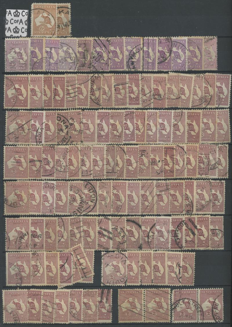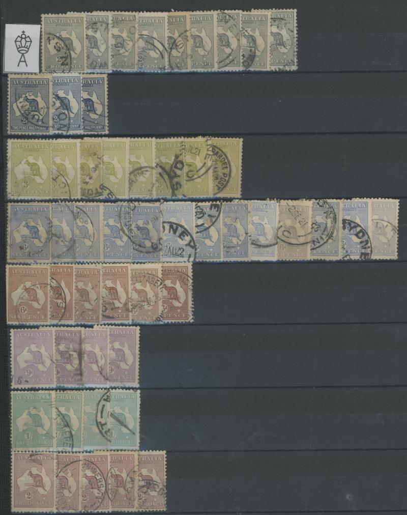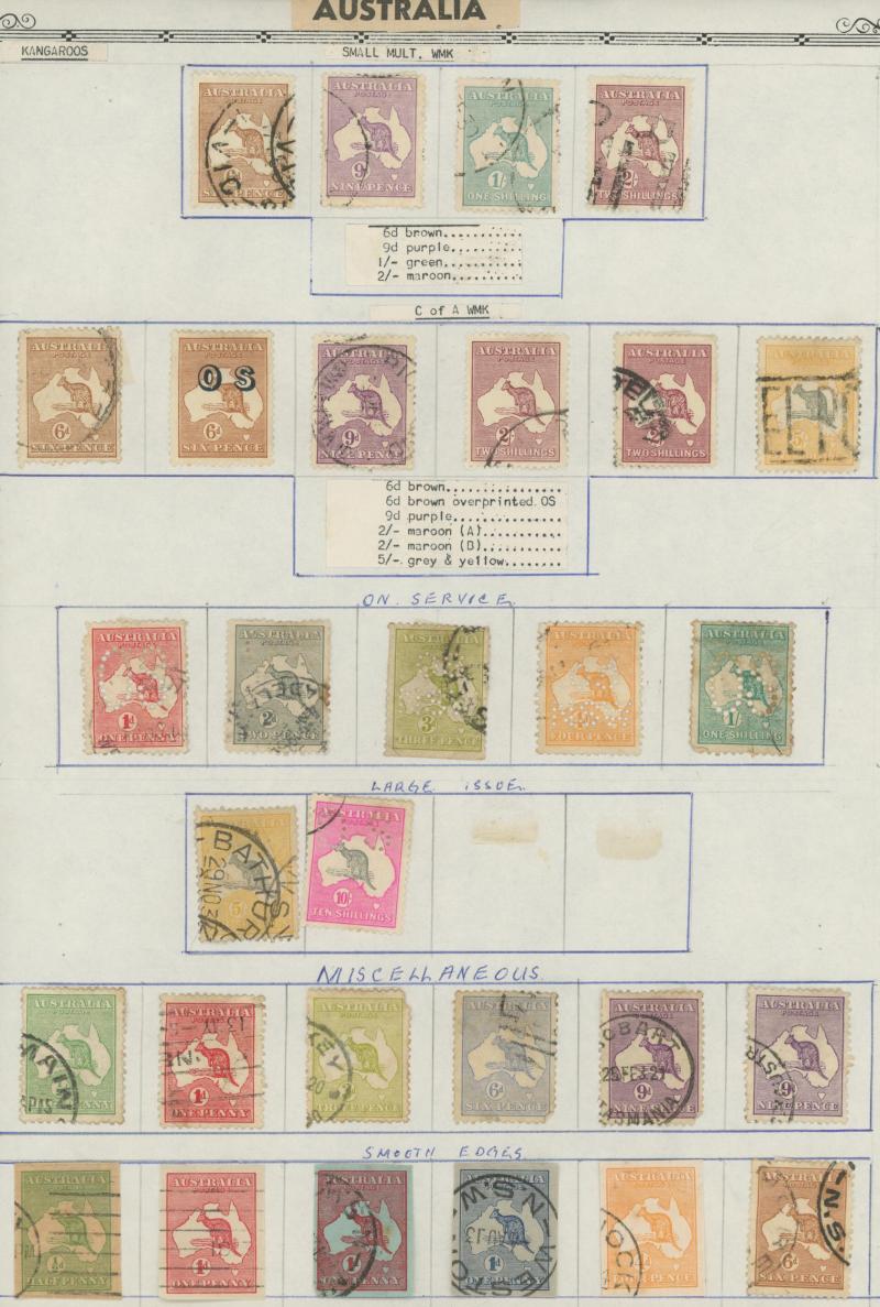 Extensive used collection from Kangaroos First Wmk to 2/- plus 5/- CTO, Punctured Large 'OS' to 5/- (parcel cancel; a few aging