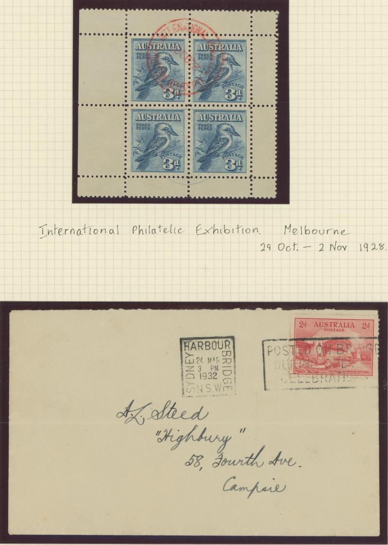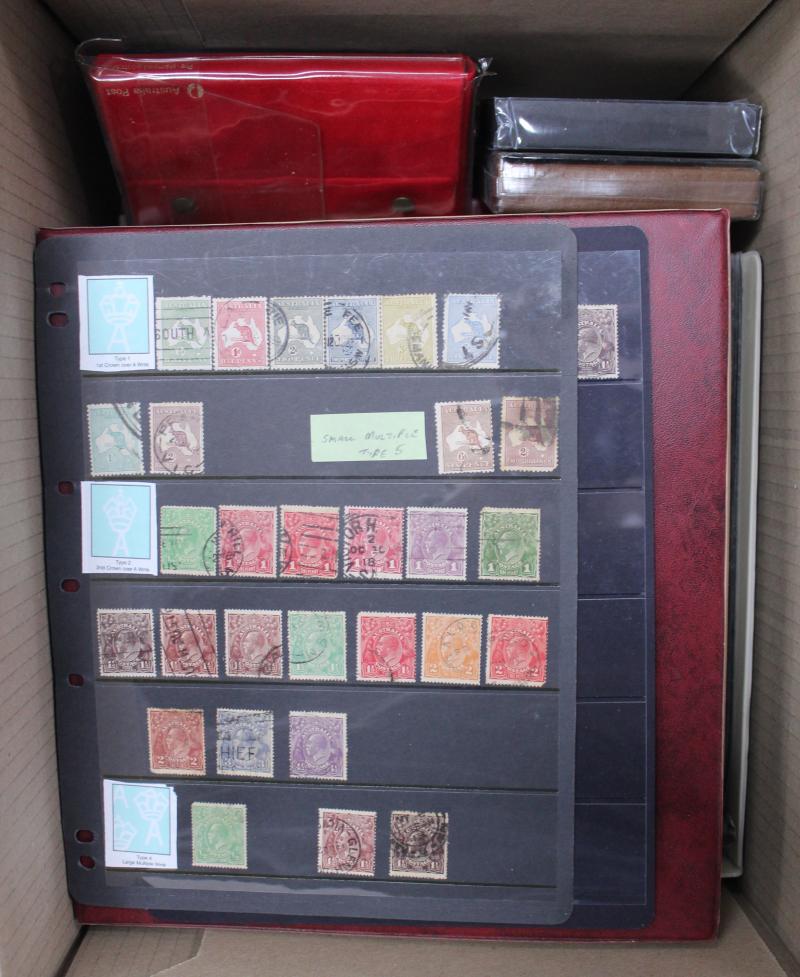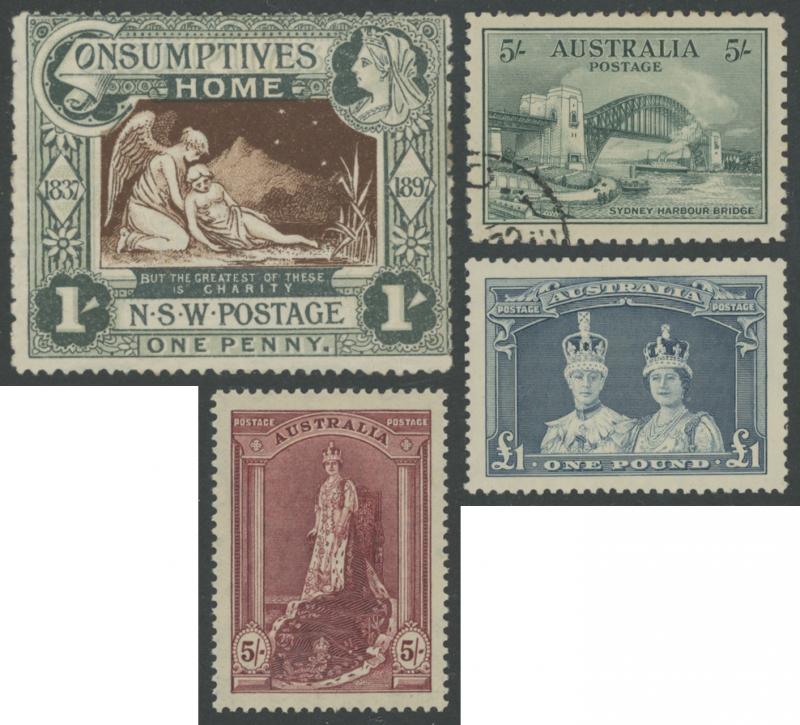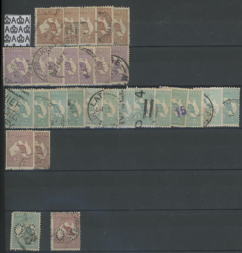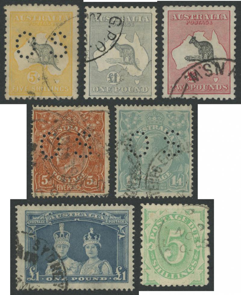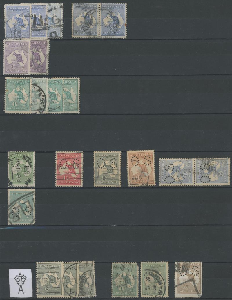 Kookburra M/S & 5/- Bridge), the latter virtually complete plus a few Postage Dues, also a 64-page stockbook of duplicates from Kangaroos & KGV Heads onwards noted 'OS' punctures & potential postmark interest, also some mint including 1937 NSW
