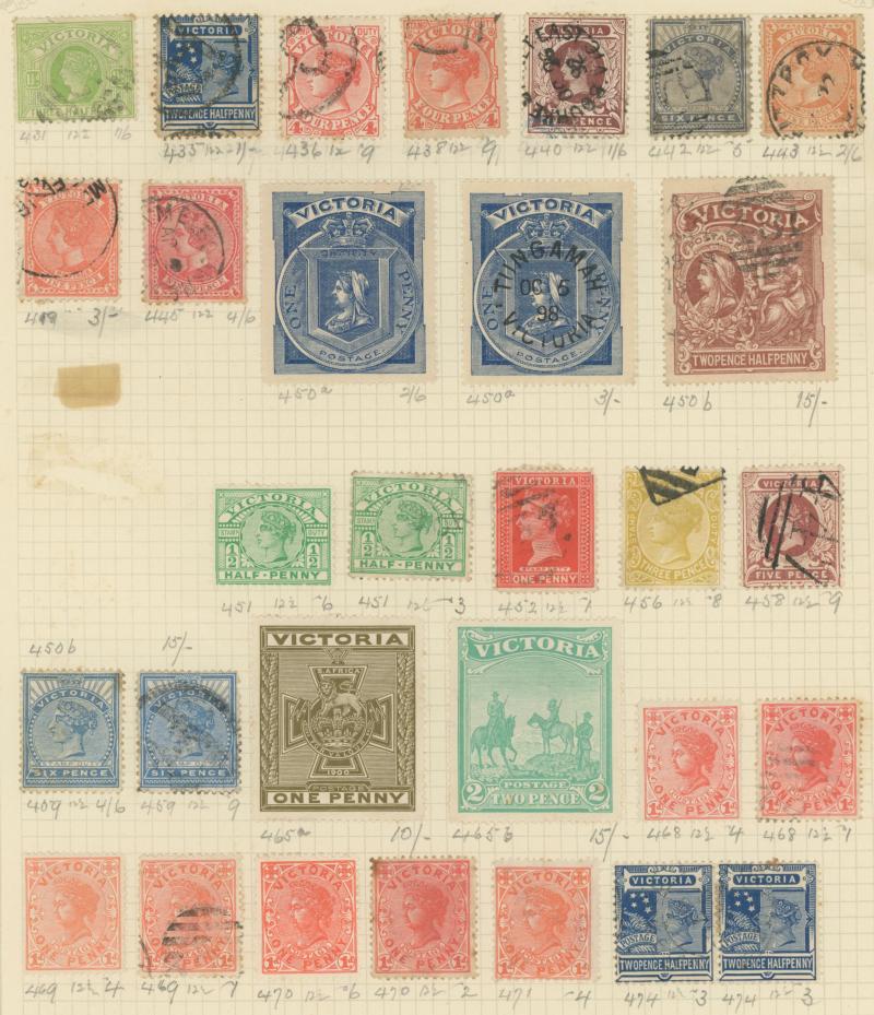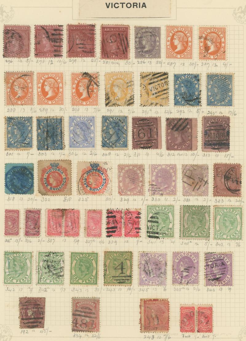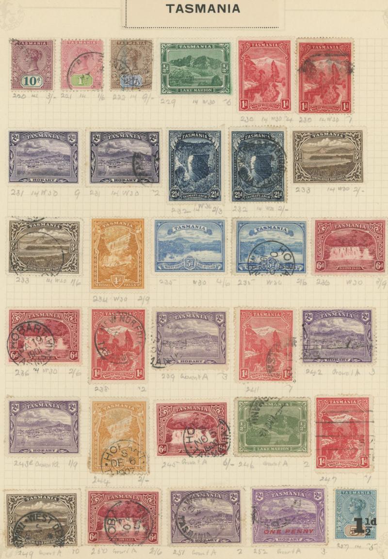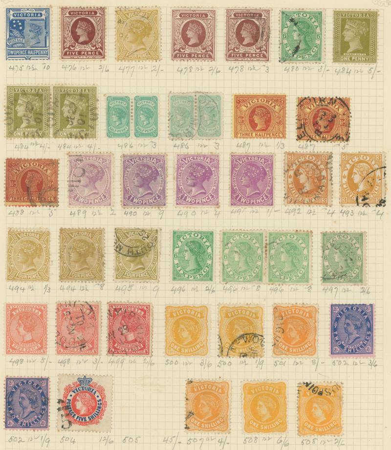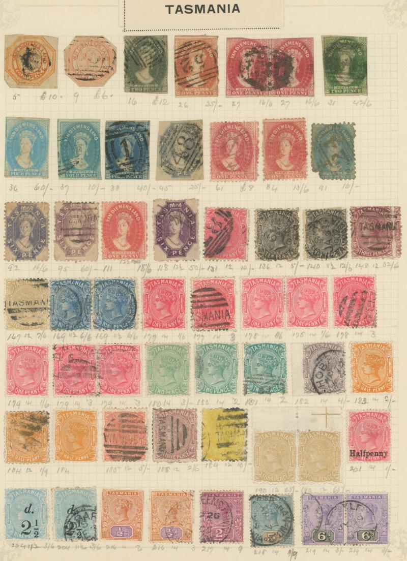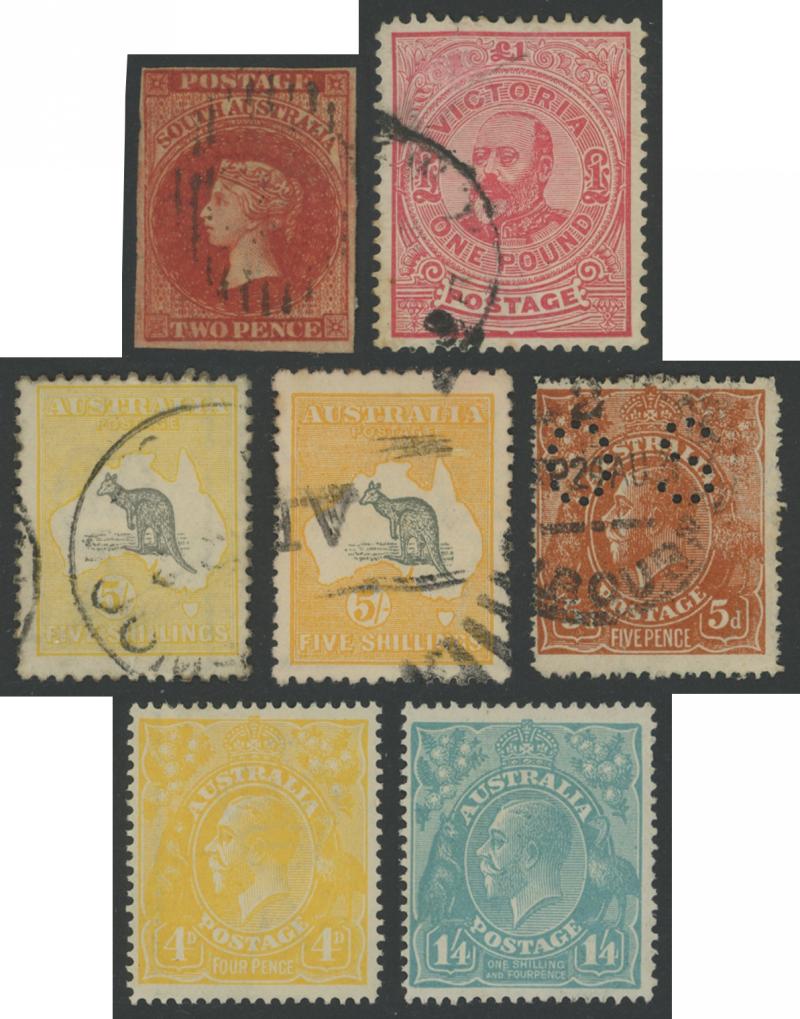 Stamps to 2/6d Thick & Thin 'POSTAGE' *, Tasmania QV Couriers 4d x2 (one almost cut-square), Chalons 1d imperf pair (cut-into) & 2d single, Sidefaces 4d buff pair * & 10d black used x2 plus a range of Pictorials, Victoria with QV Half-Lengths 1d x5,