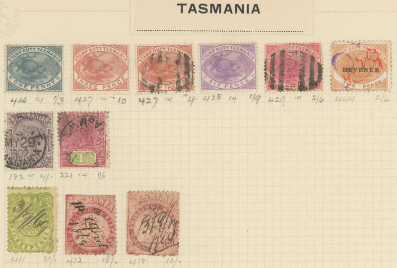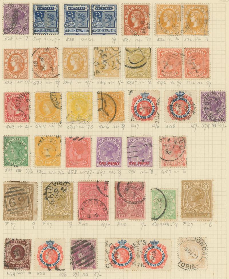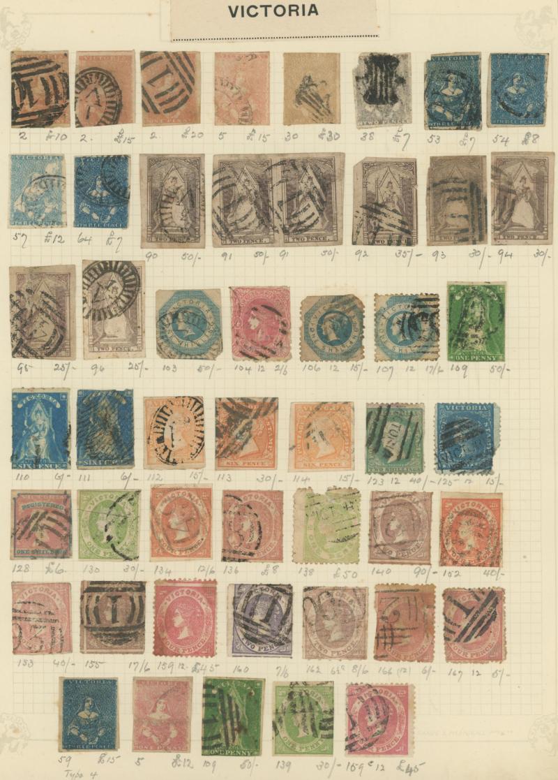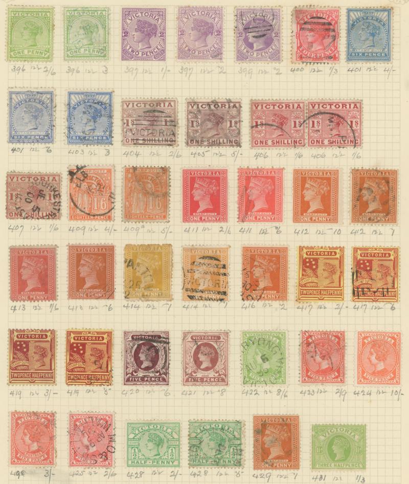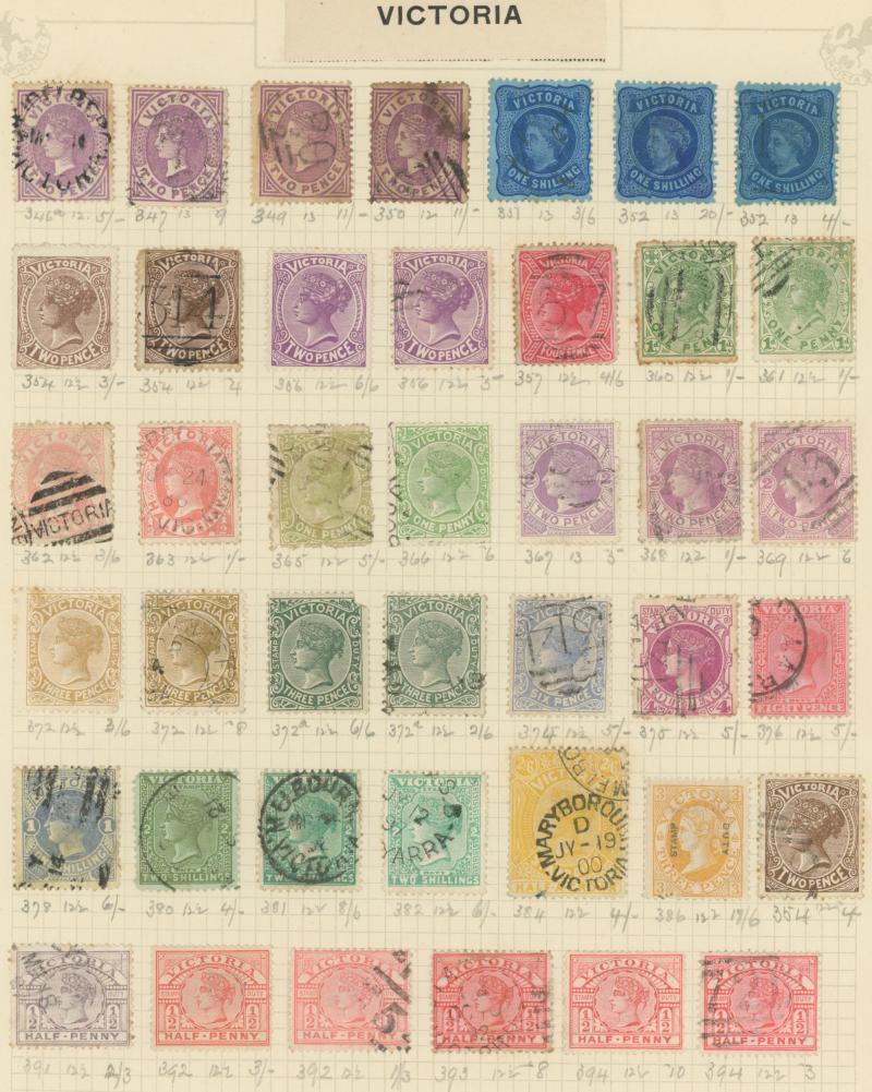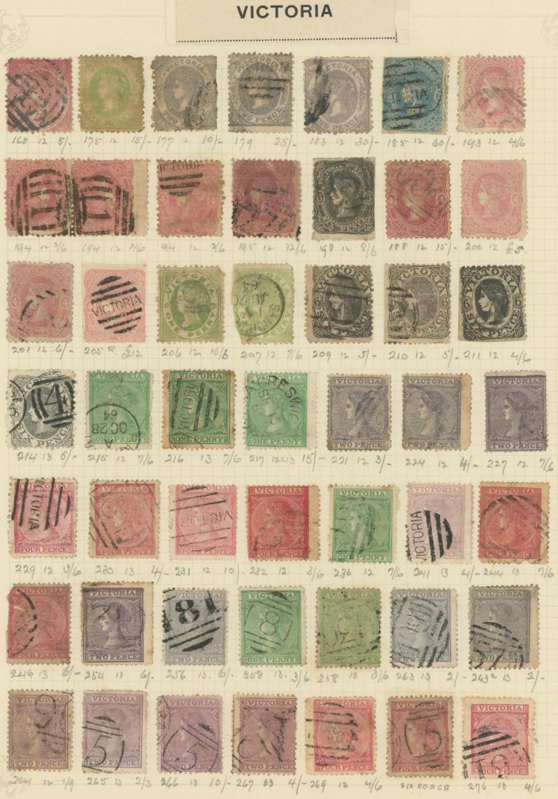 Stamps to 2/6d Thick & Thin 'POSTAGE' *, Tasmania QV Couriers 4d x2 (one almost cut-square), Chalons 1d imperf pair (cut-into) & 2d single, Sidefaces 4d buff pair * & 10d black used x2 plus a range of Pictorials, Victoria with QV Half-Lengths 1d x5,
