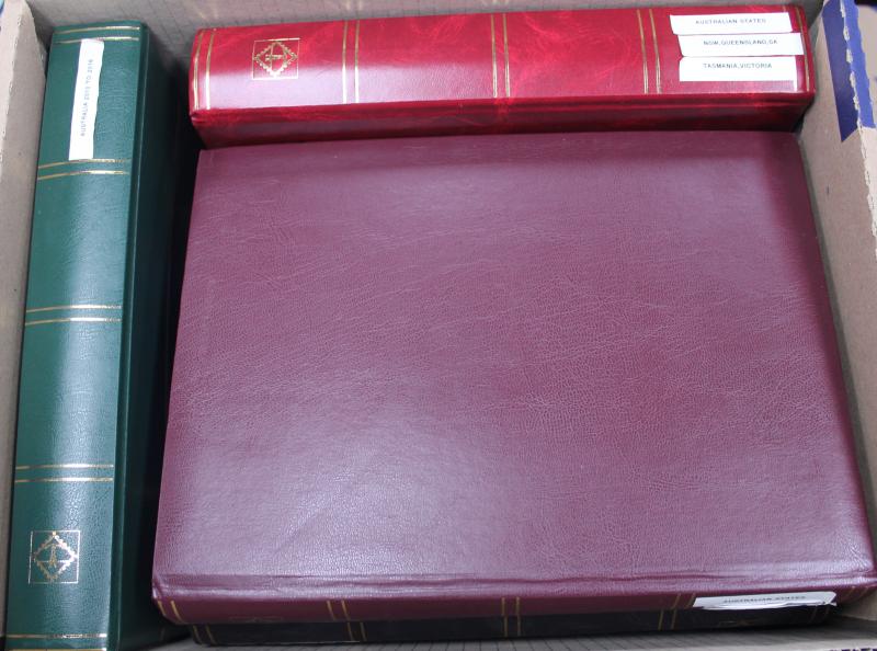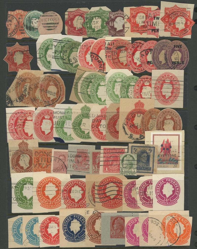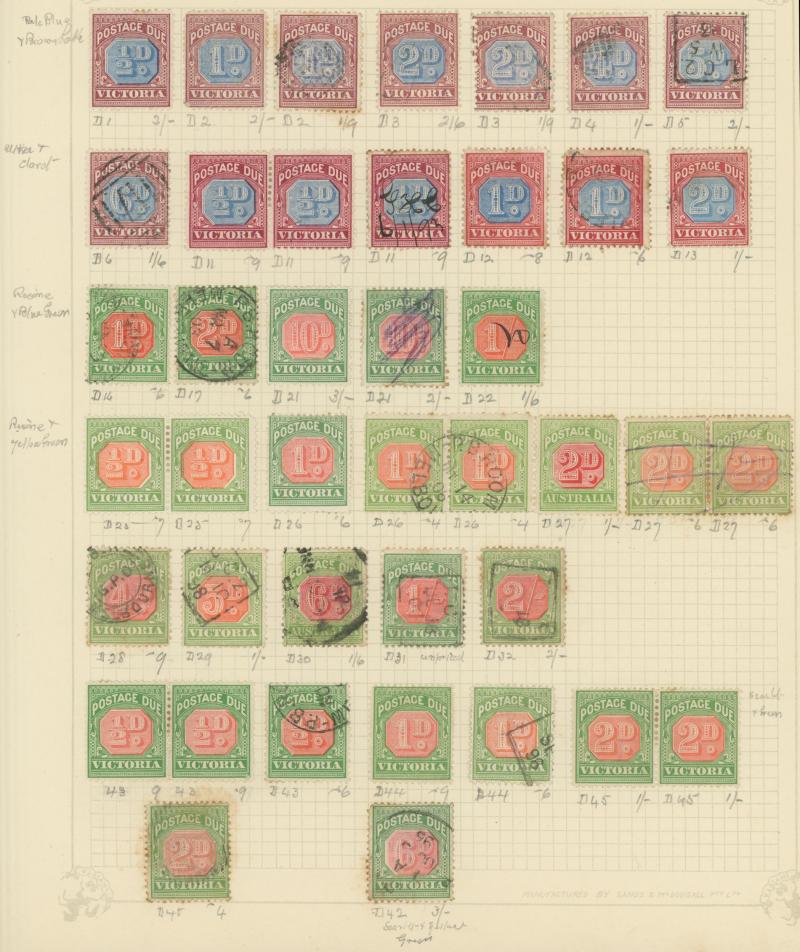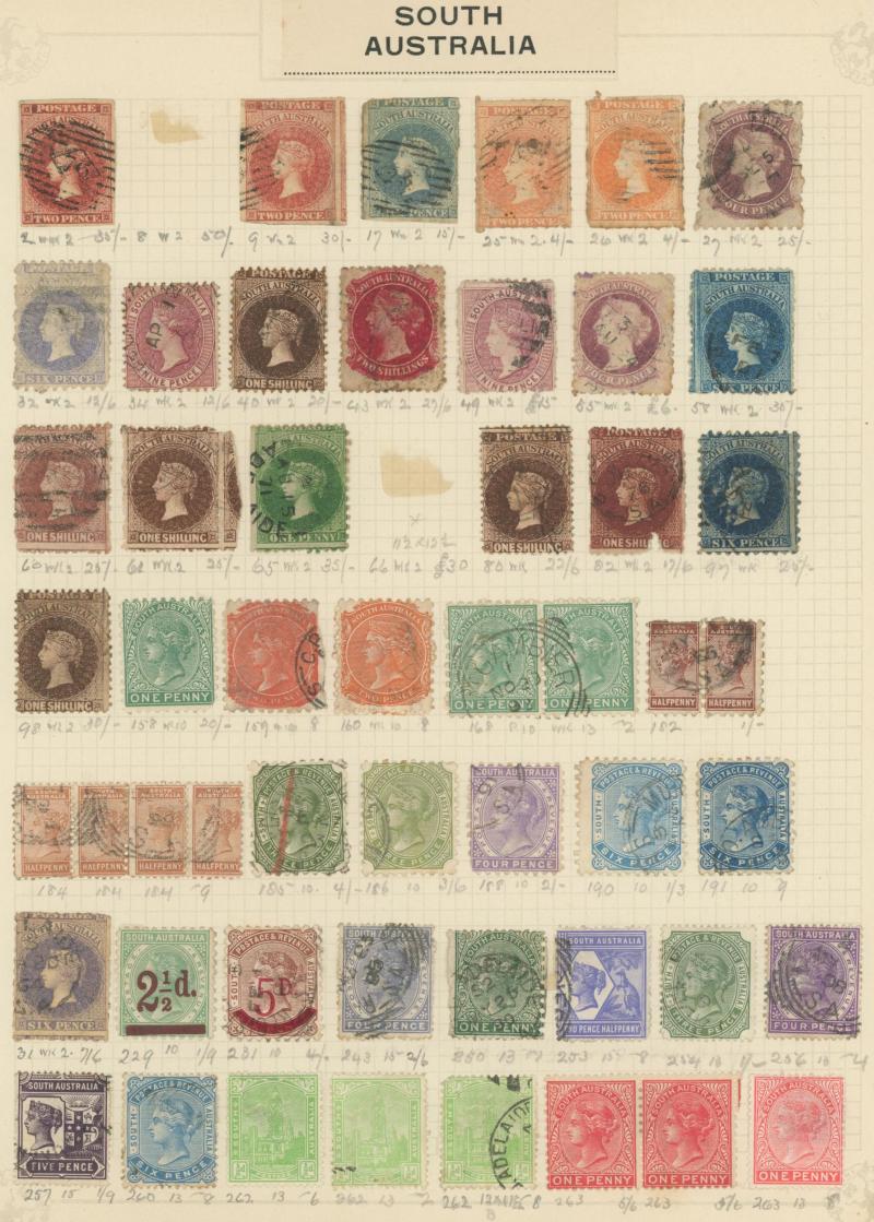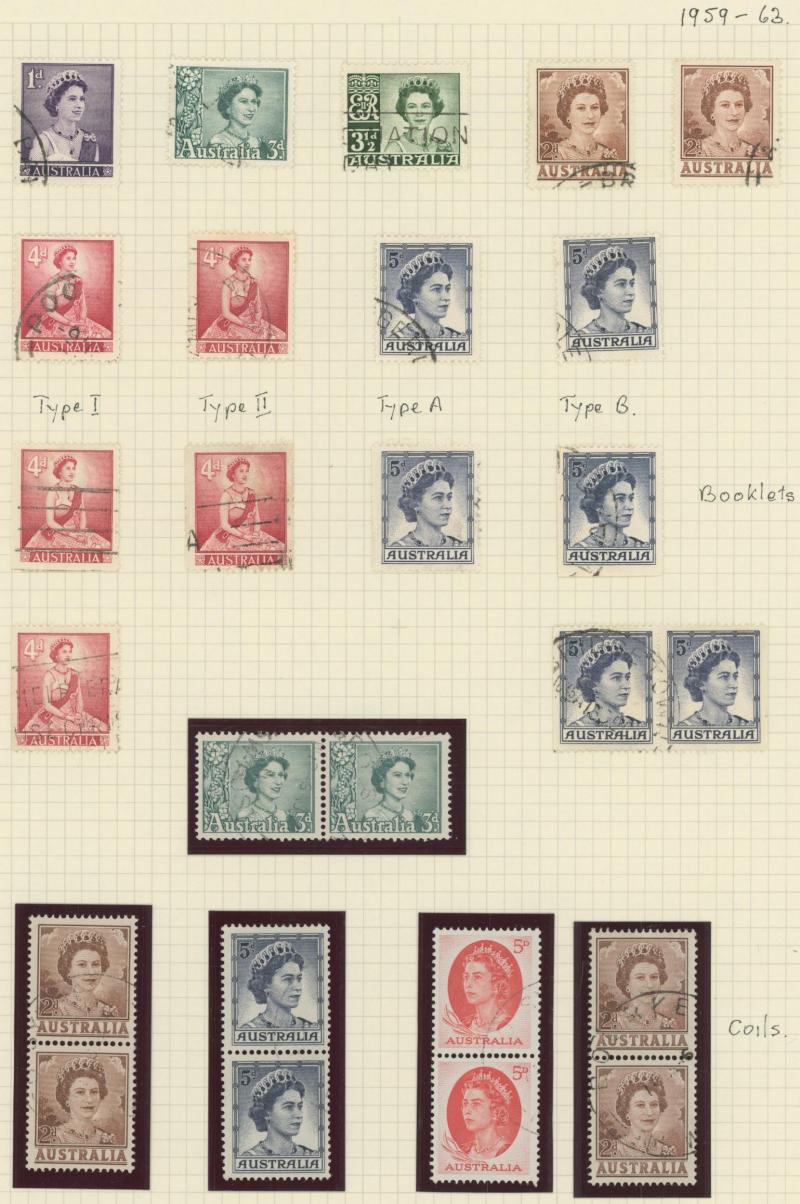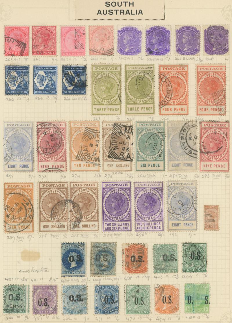 Stamps to 2/6d Thick & Thin 'POSTAGE' *, Tasmania QV Couriers 4d x2 (one almost cut-square), Chalons 1d imperf pair (cut-into) & 2d single, Sidefaces 4d buff pair * & 10d black used x2 plus a range of Pictorials, Victoria with QV Half-Lengths 1d x5,