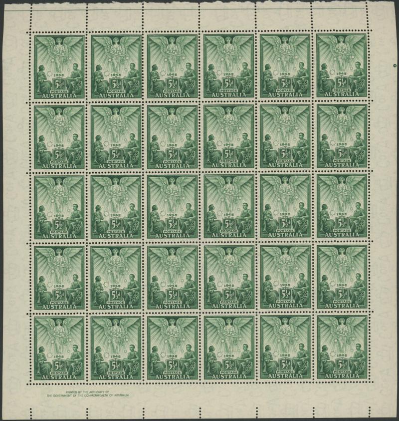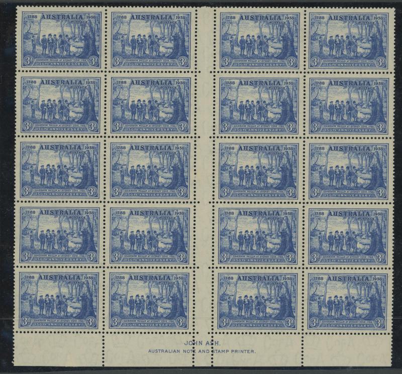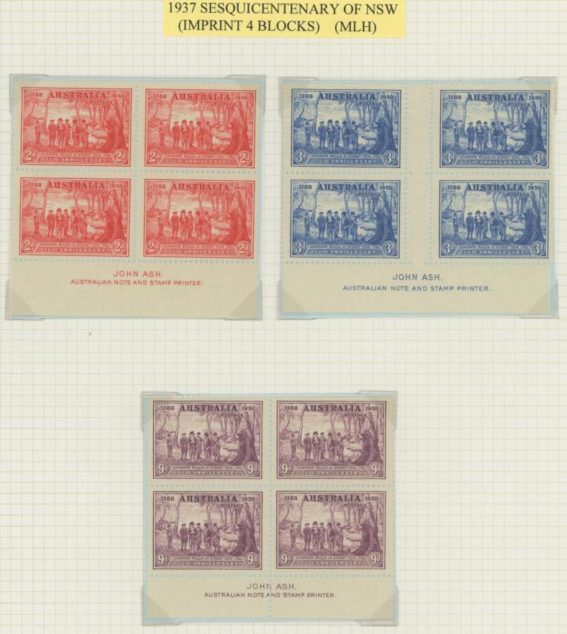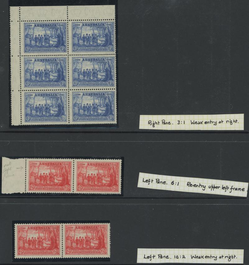 Sesquicentenary 2d scarlet Re-Entry Upper Left Frame [Pos L6/1] & Weak Entry at Right [Pos L10/2] in horizontal pairs with normal stamps **, 3d blue Weak Entry at Right [Pos R3/1] in a block of 6 ** and John Ash Imprint block ** in a block of 20