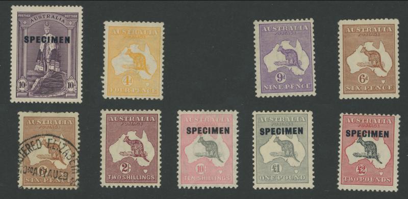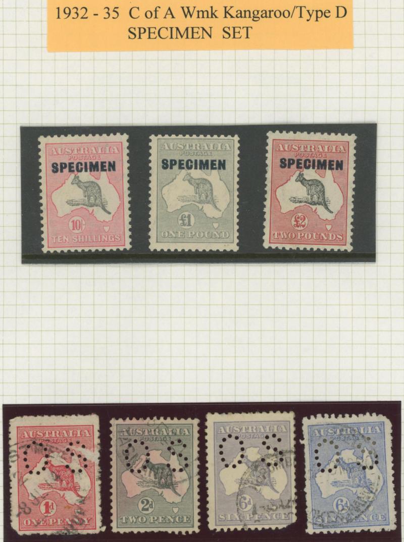 Pre-Decimal collection mint and used on leaves including Kangaroos with CofA 'SPECIMEN' overprints to £2, KGV 1d Engraved * two