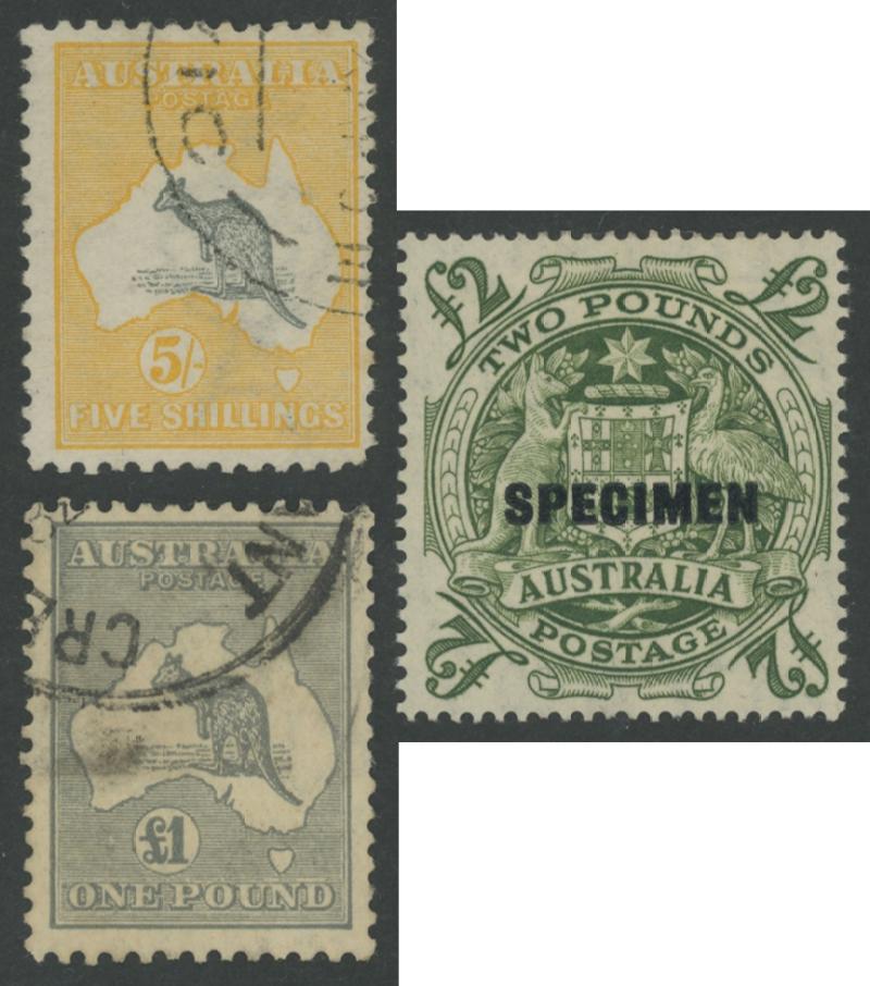 Collection including Kangaroos noted Third Watermark £1 grey and £2 Type C 'SPECIMEN' overprints *, plus Postage Dues, KGV Heads