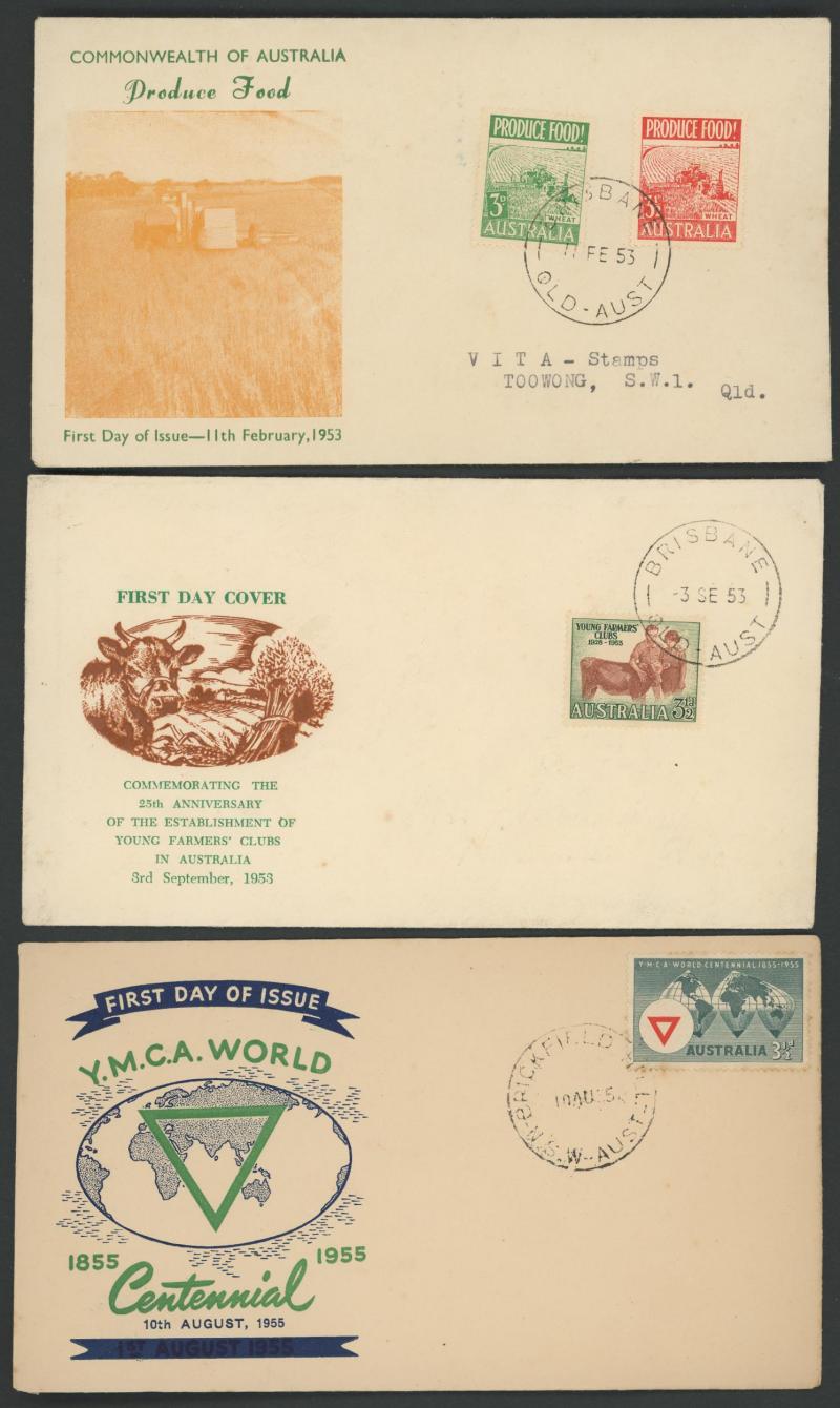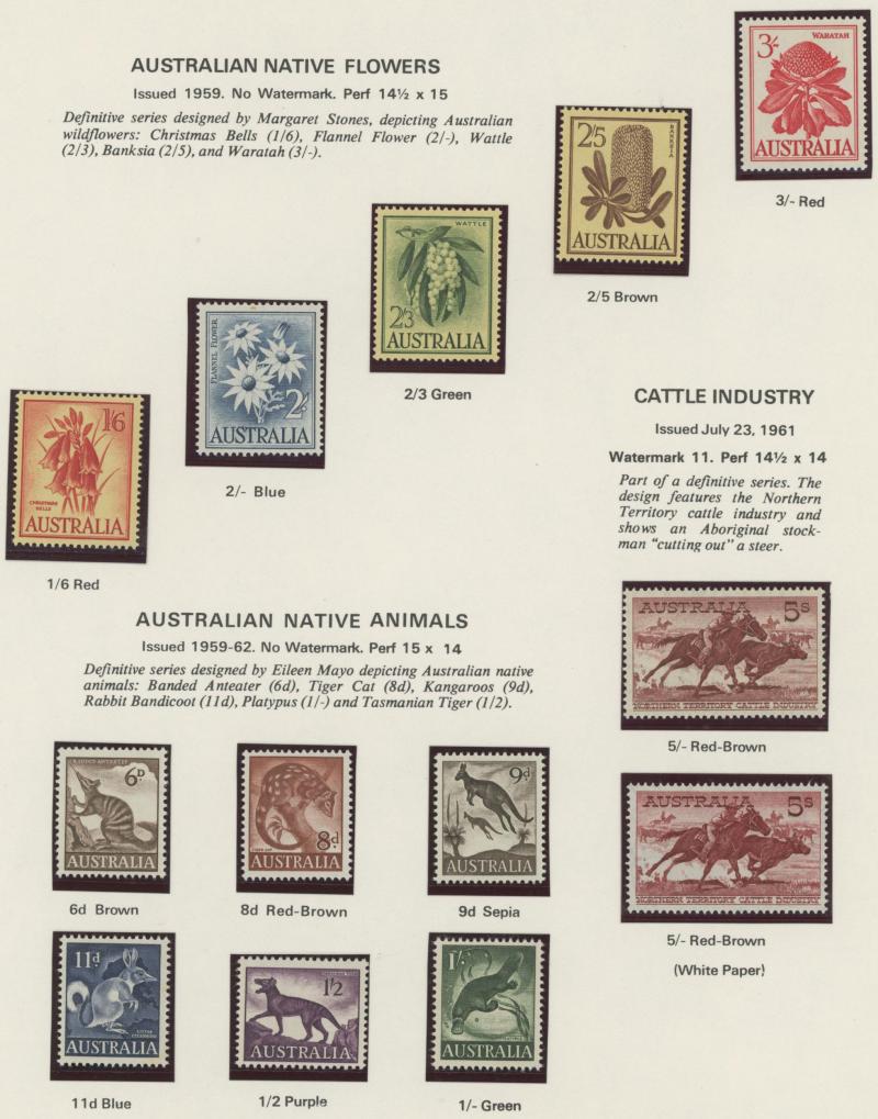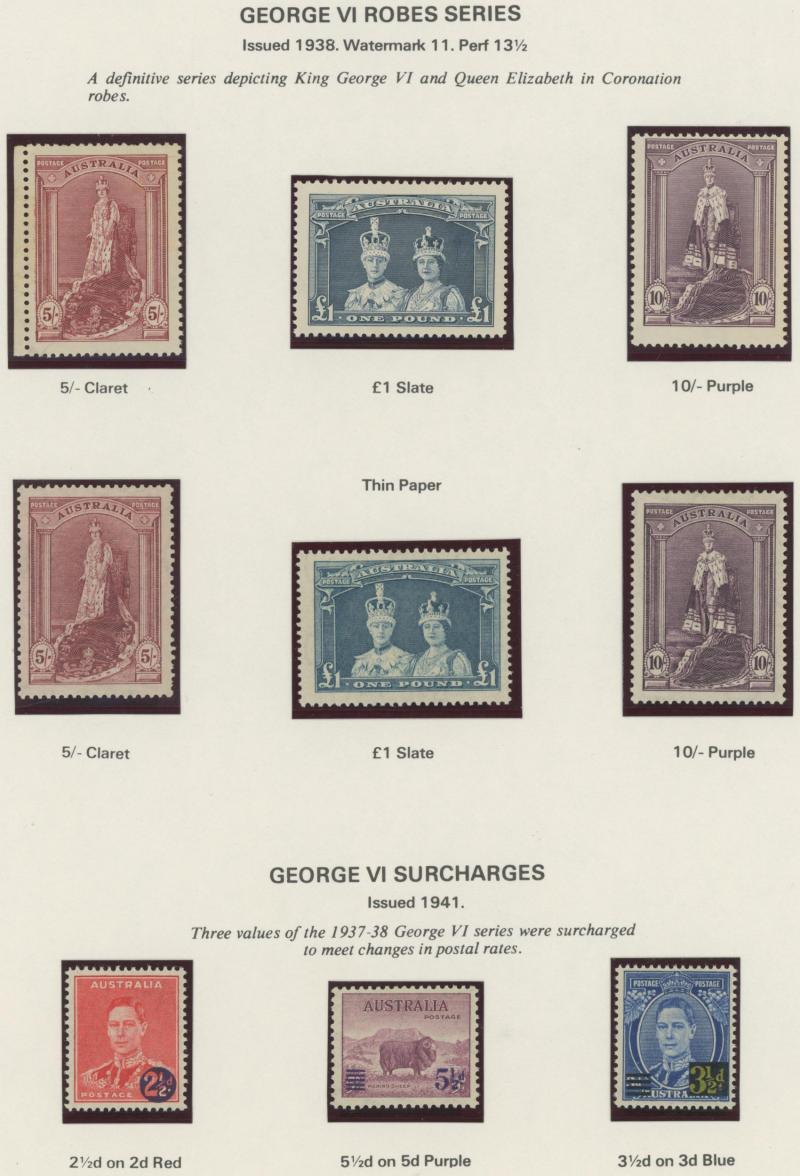 Commemoratives predominantly mint (ex Bridge set) including 3d Kookaburra M/S and KGVI & QEII issues including Robes set both papers *, Arms set plus 'SPECIMEN' overprints *, Produce Food blocks of 9 ** & used, 5/- Cattleman White Paper **,