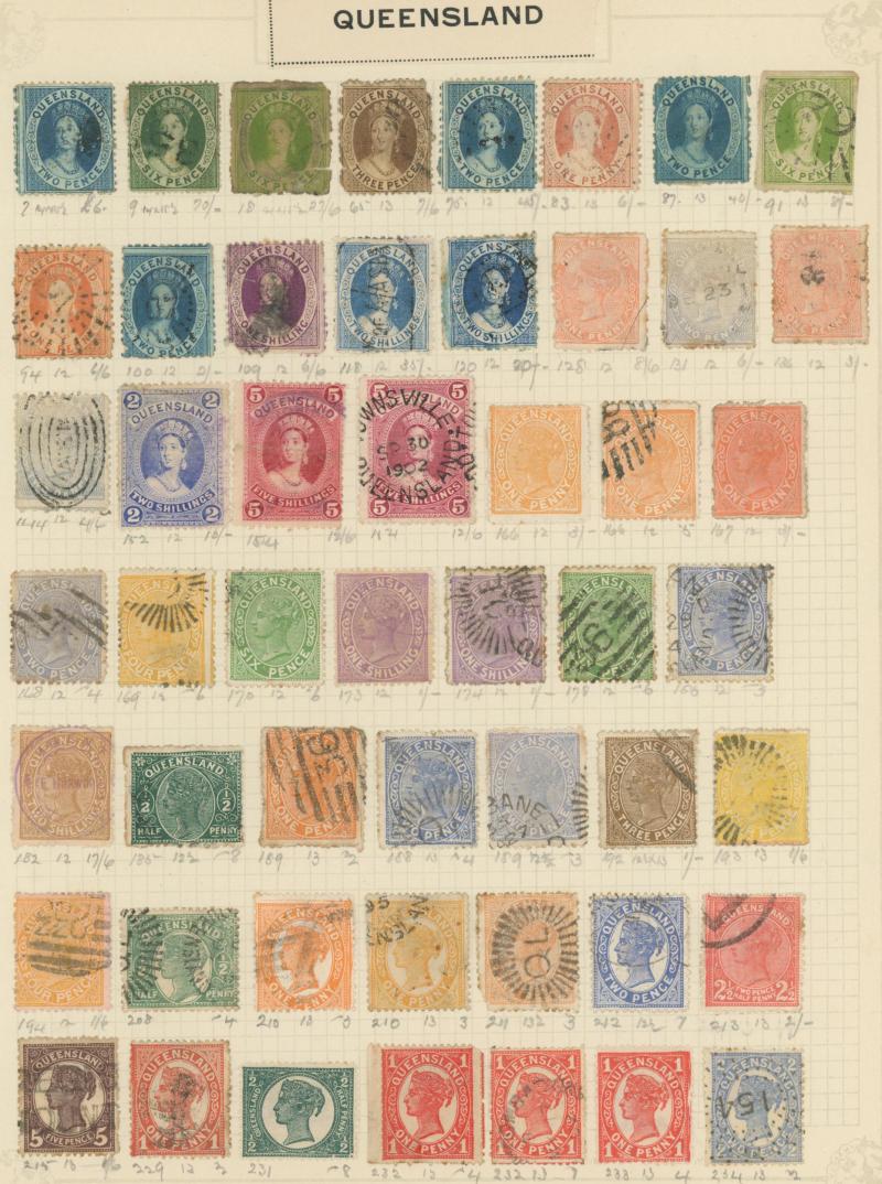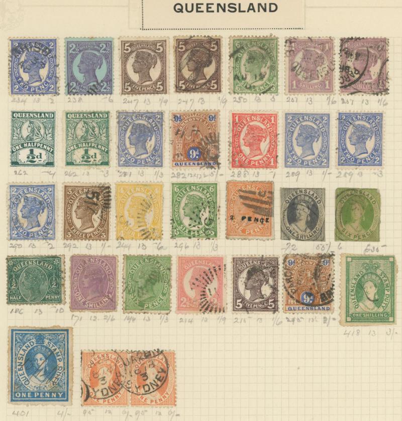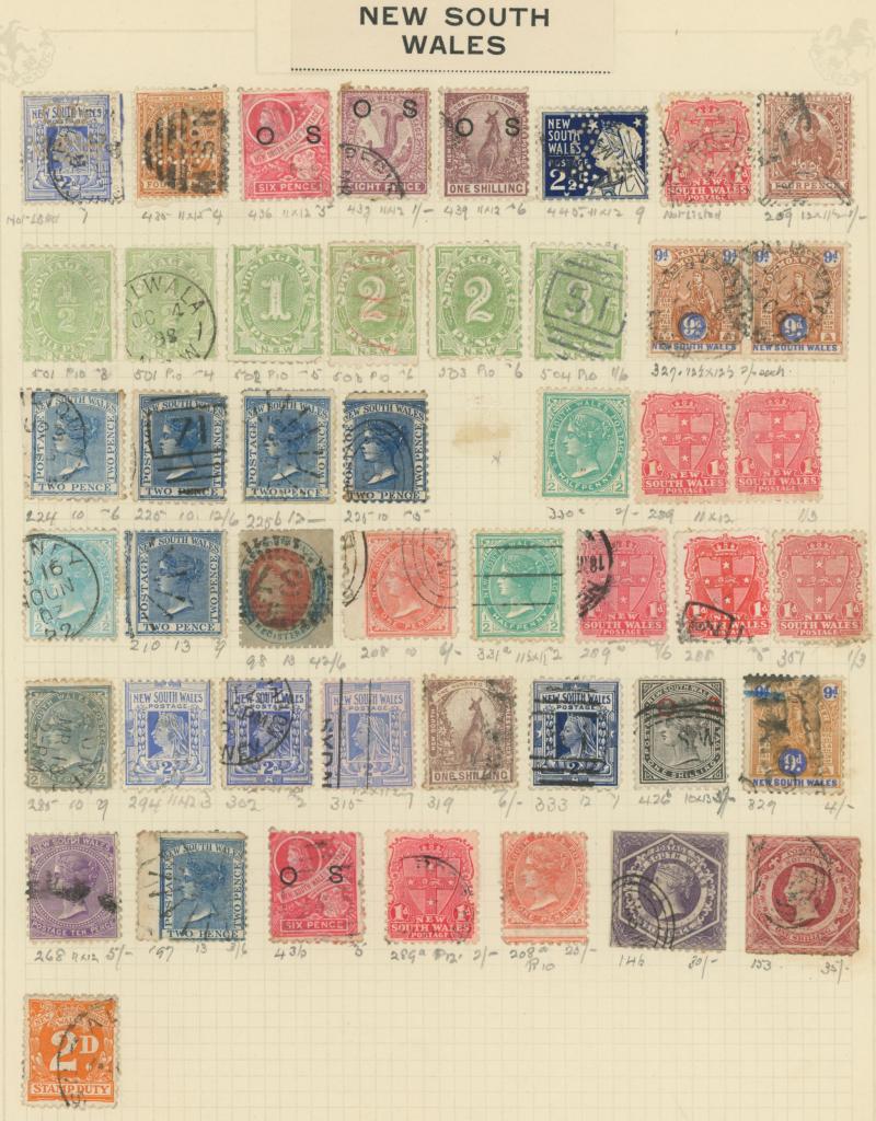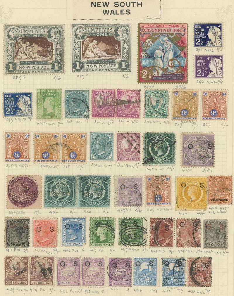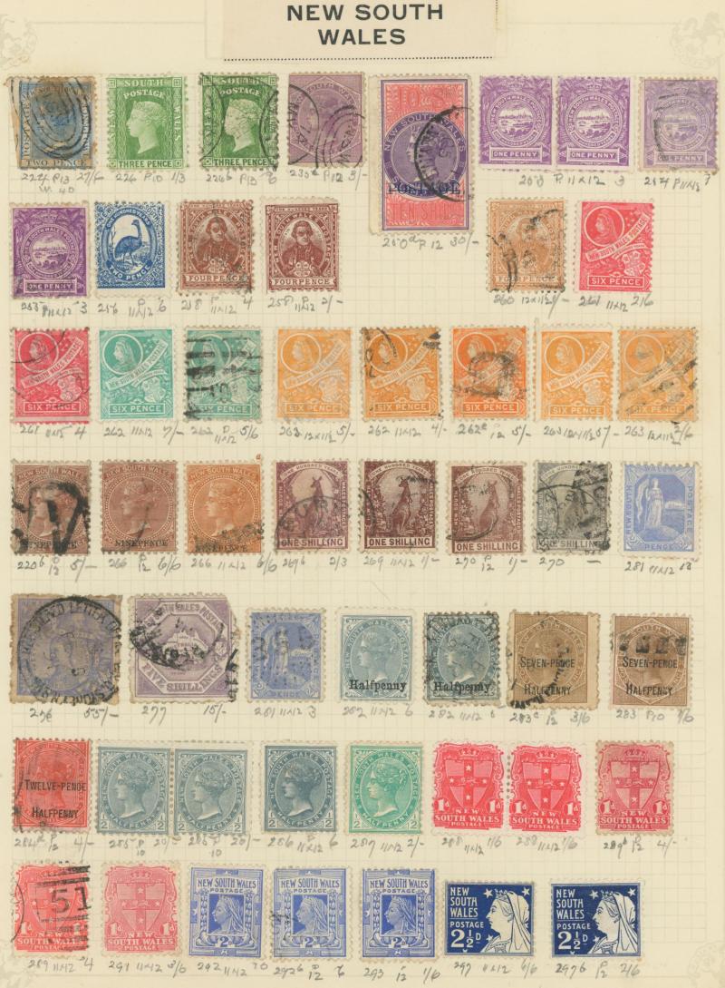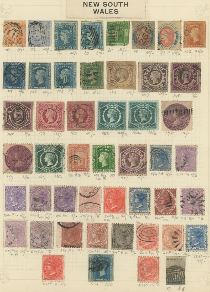Collection on old-time leaves from Colonies predominantly used with New South Wales from QV Laureates & Diadems imperfs noted