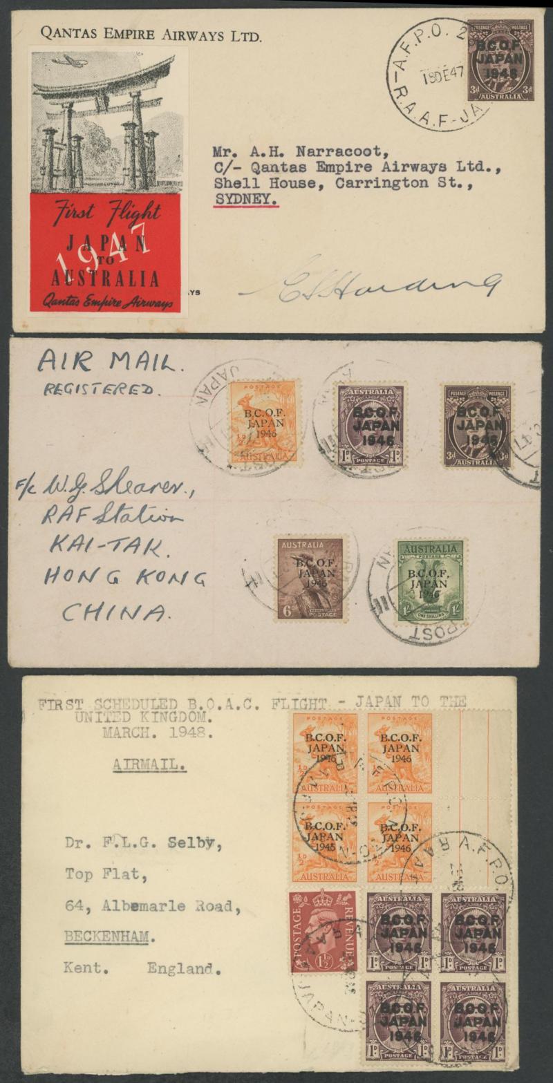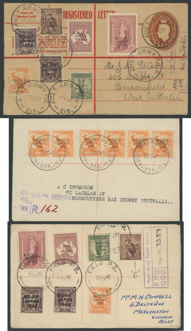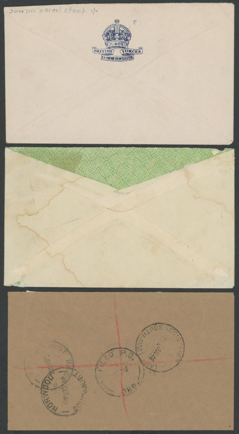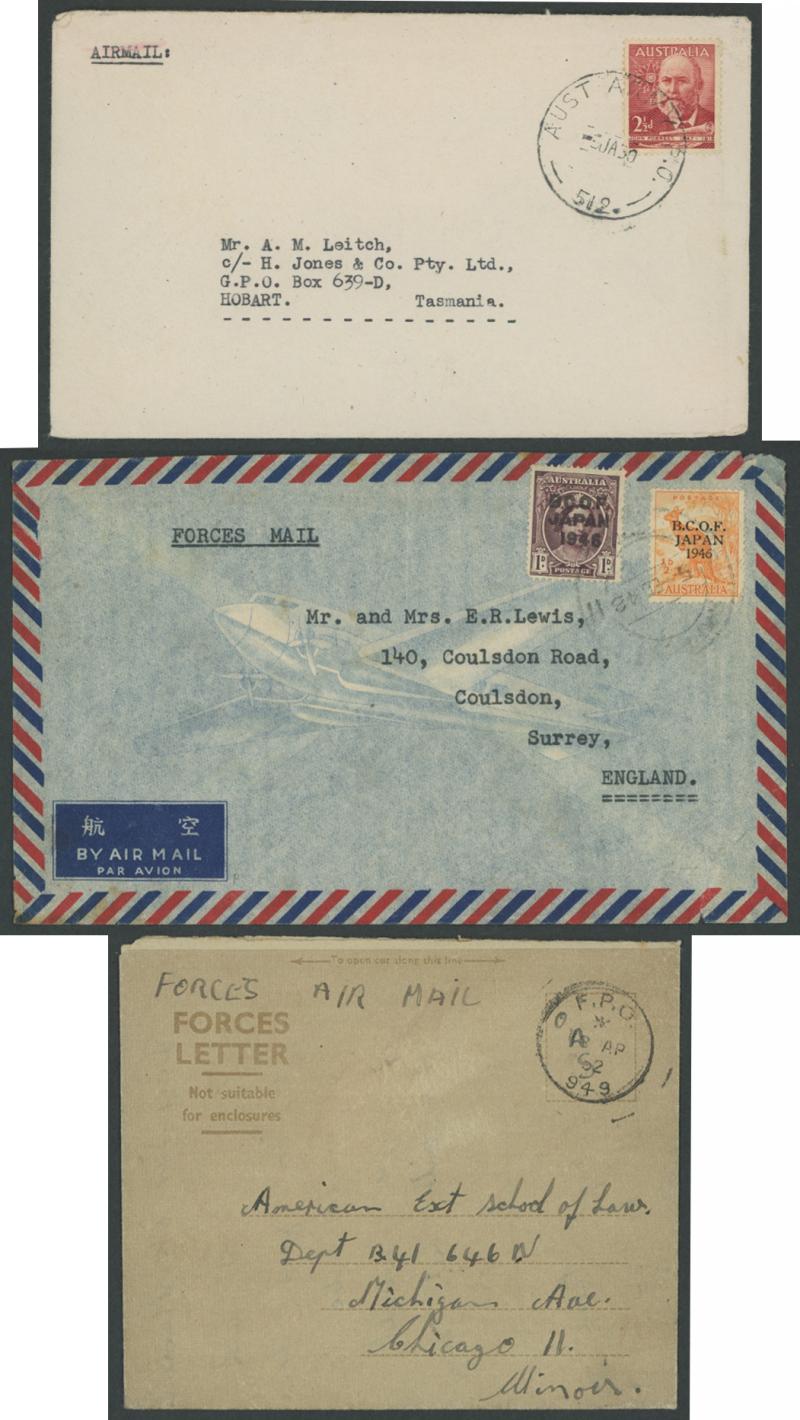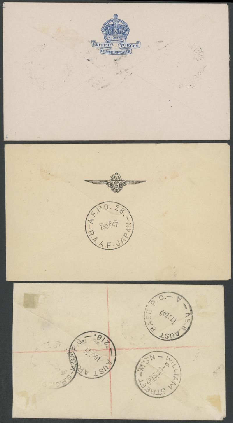 'FORCES/LETTER' aerogramme with 'FPO/ 949 ' cds to USA so postage should have been paid, 1948 airmail to GB with BCOF ½d & 1d only tied by Indian-pattern cds, 1950 cover to Australia with 2½d Forrest tied by 'AUST ARMY PO/5JA50/ 512. ' cds used at