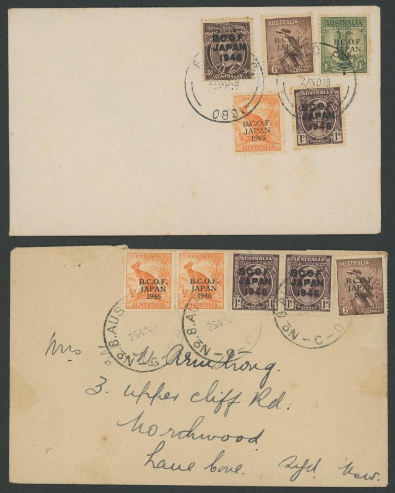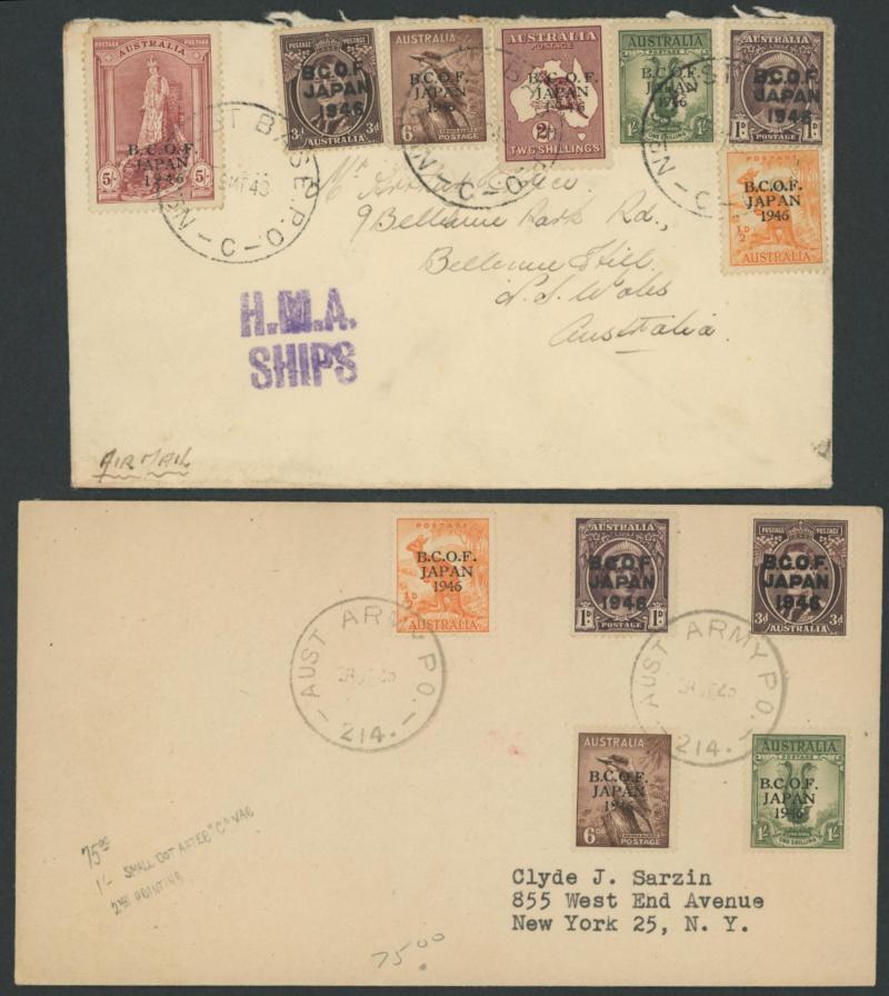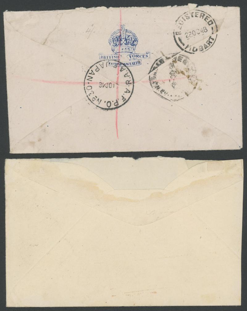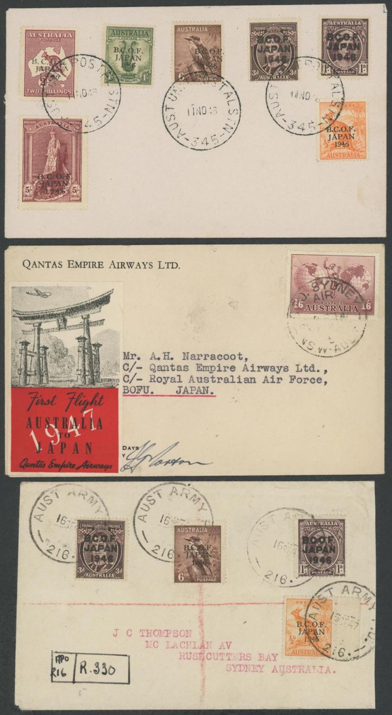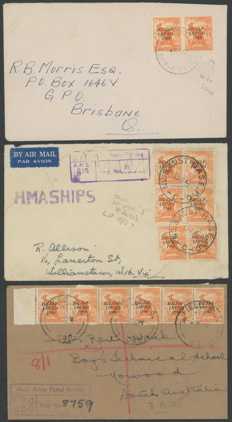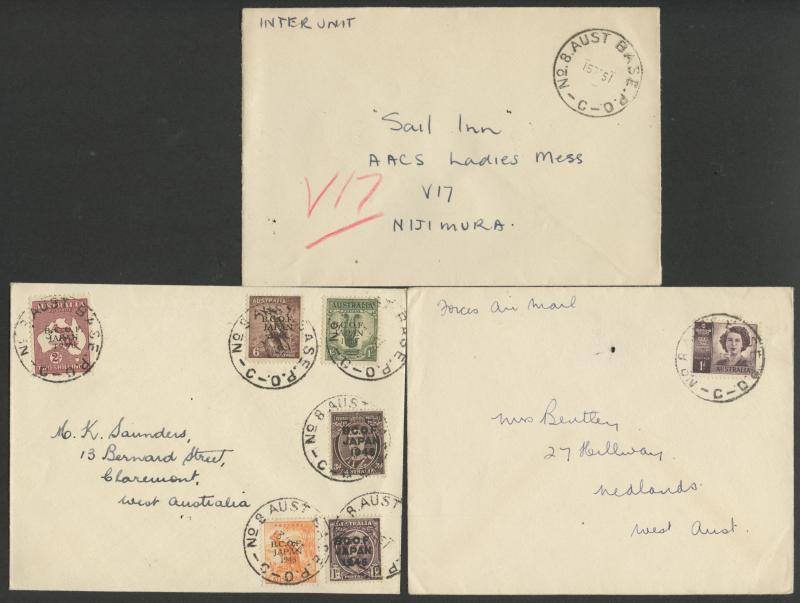 'FORCES/LETTER' aerogramme with 'FPO/ 949 ' cds to USA so postage should have been paid, 1948 airmail to GB with BCOF ½d & 1d only tied by Indian-pattern cds, 1950 cover to Australia with 2½d Forrest tied by 'AUST ARMY PO/5JA50/ 512. ' cds used at