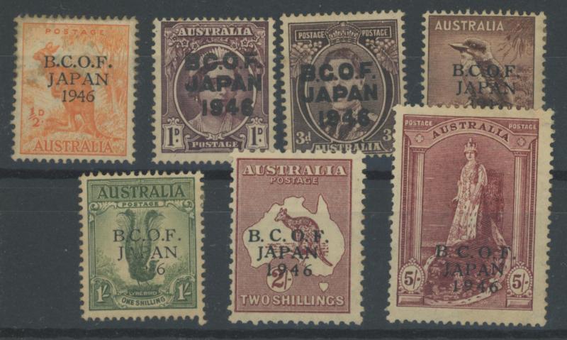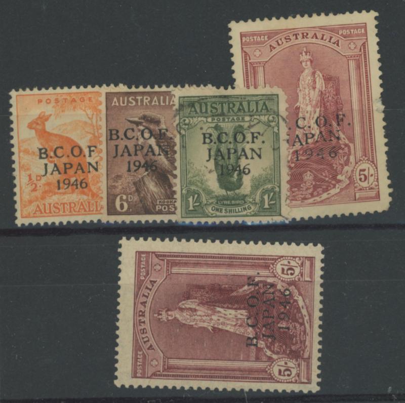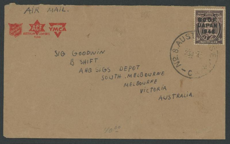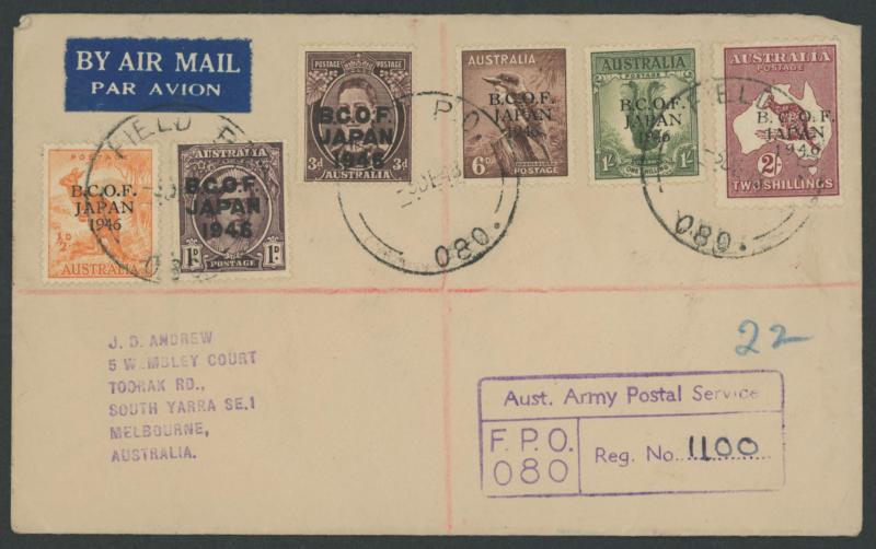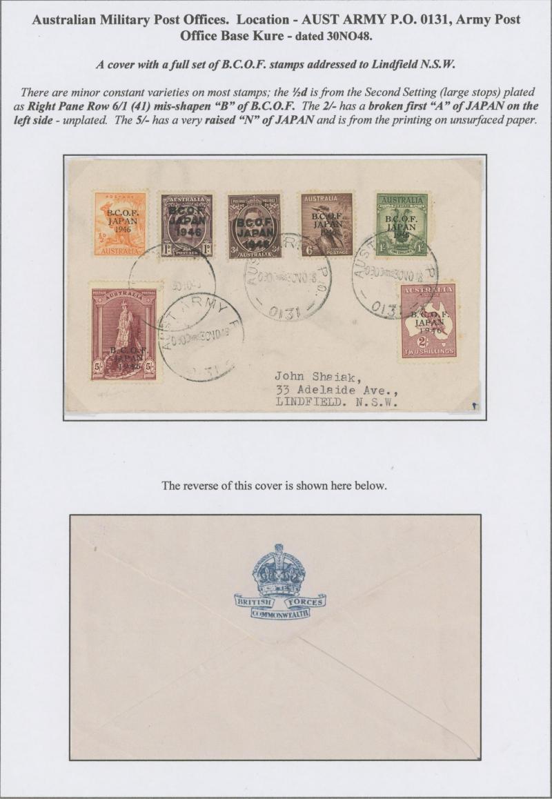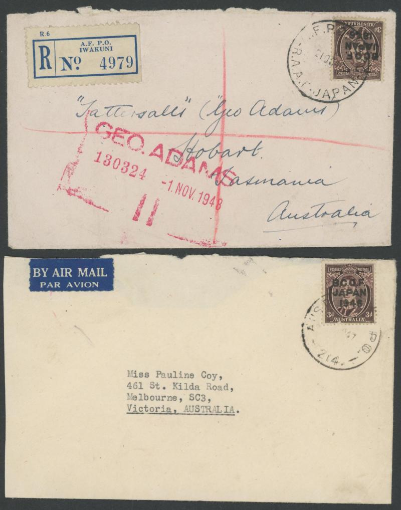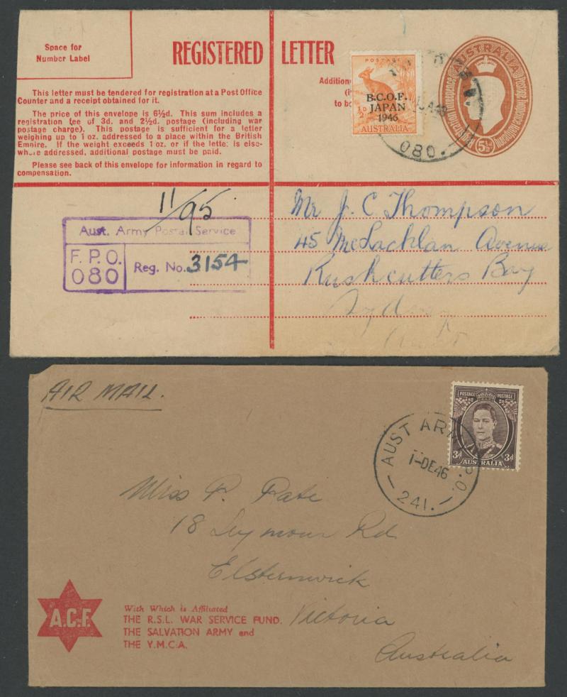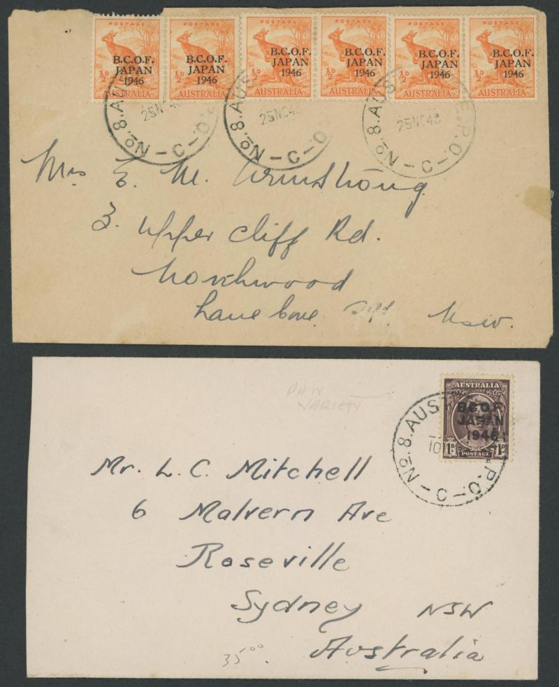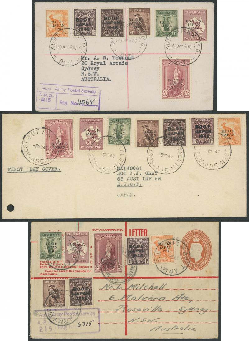 'FORCES/LETTER' aerogramme with 'FPO/ 949 ' cds to USA so postage should have been paid, 1948 airmail to GB with BCOF ½d & 1d only tied by Indian-pattern cds, 1950 cover to Australia with 2½d Forrest tied by 'AUST ARMY PO/5JA50/ 512. ' cds used at