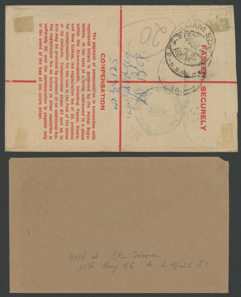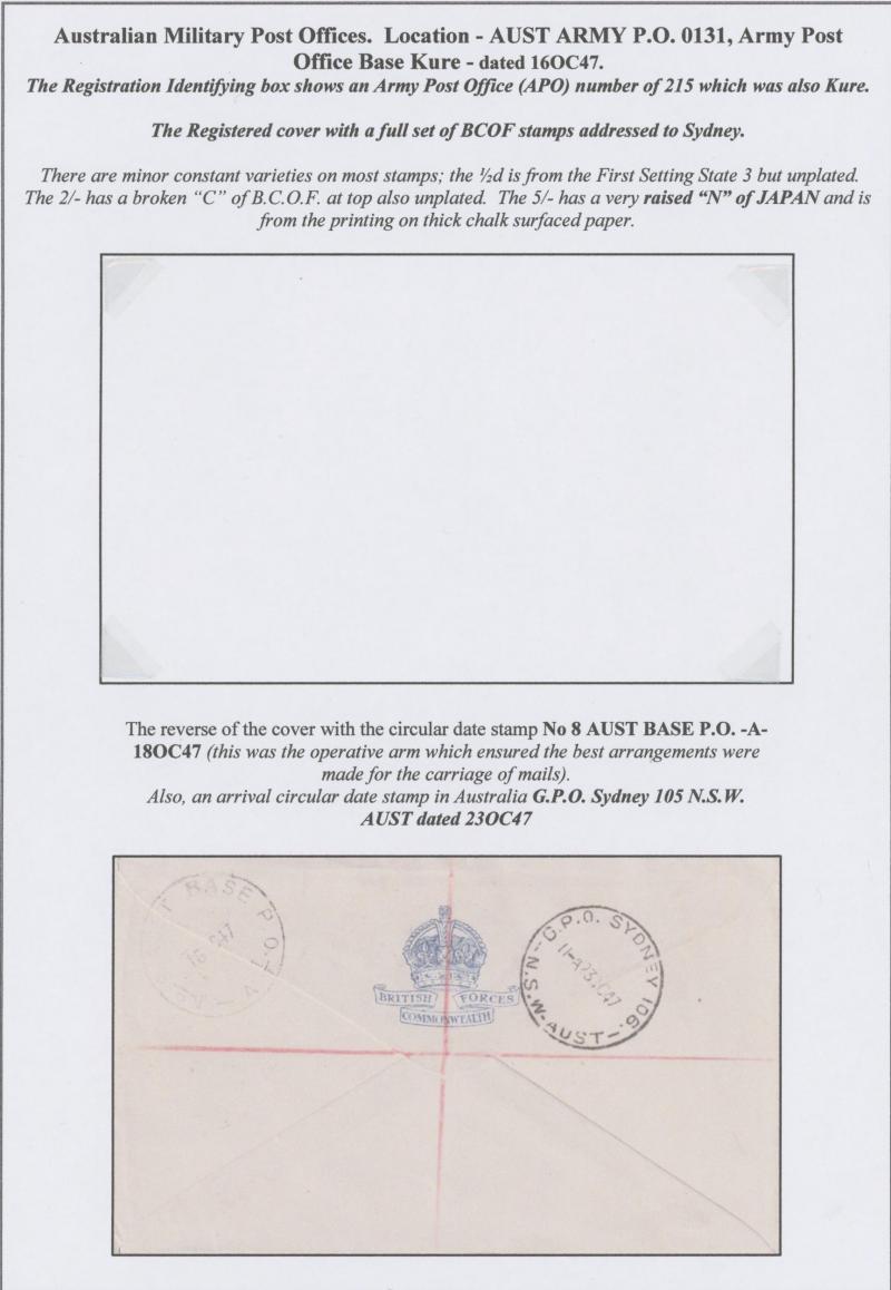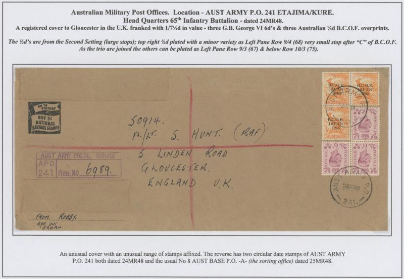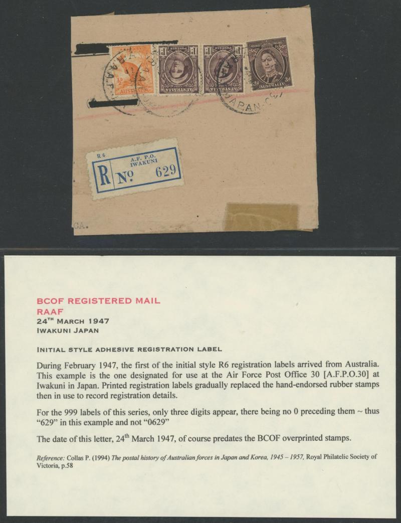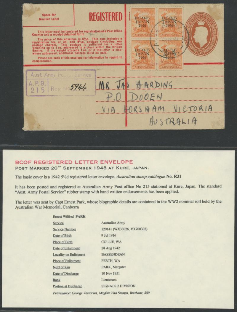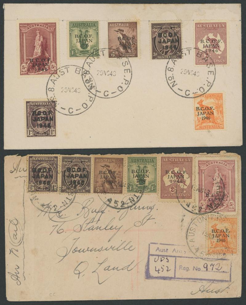 registered including a few Australian Registration Envelopes with BCOF stamps (combination frankings), a few unusual items including 1948 registered cover to GB with combination franking of BCOF ½d x3 + GB 6d x3, 1952 usage by an Aussie of British