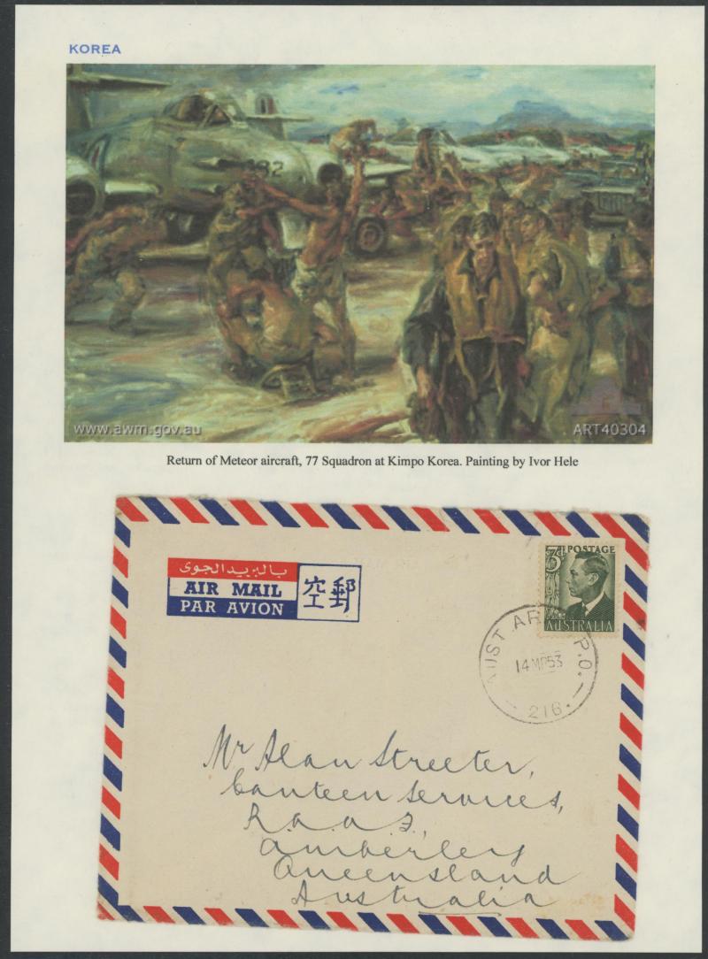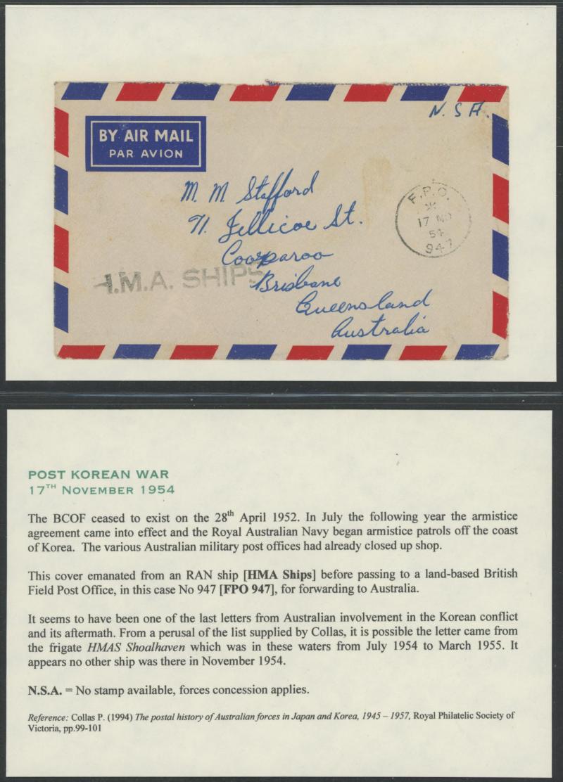 SHIPS' cachets to Kure and three to Nijimura including to "Ladies Mess" with AUST UNIT POSTAL STN/453' used at Britcom GH Kure, and with 'AUST UNIT POSTAL STN/388' cds presumably used by 1RAR in Korea (Collas states its use at Nijimura ended "around