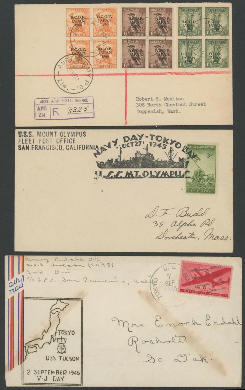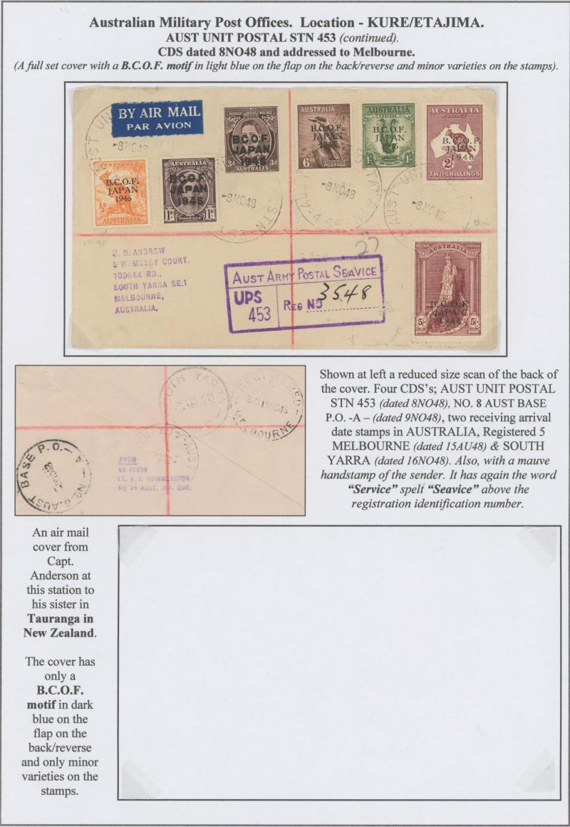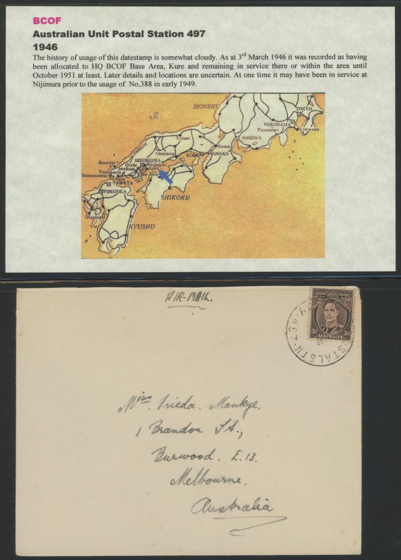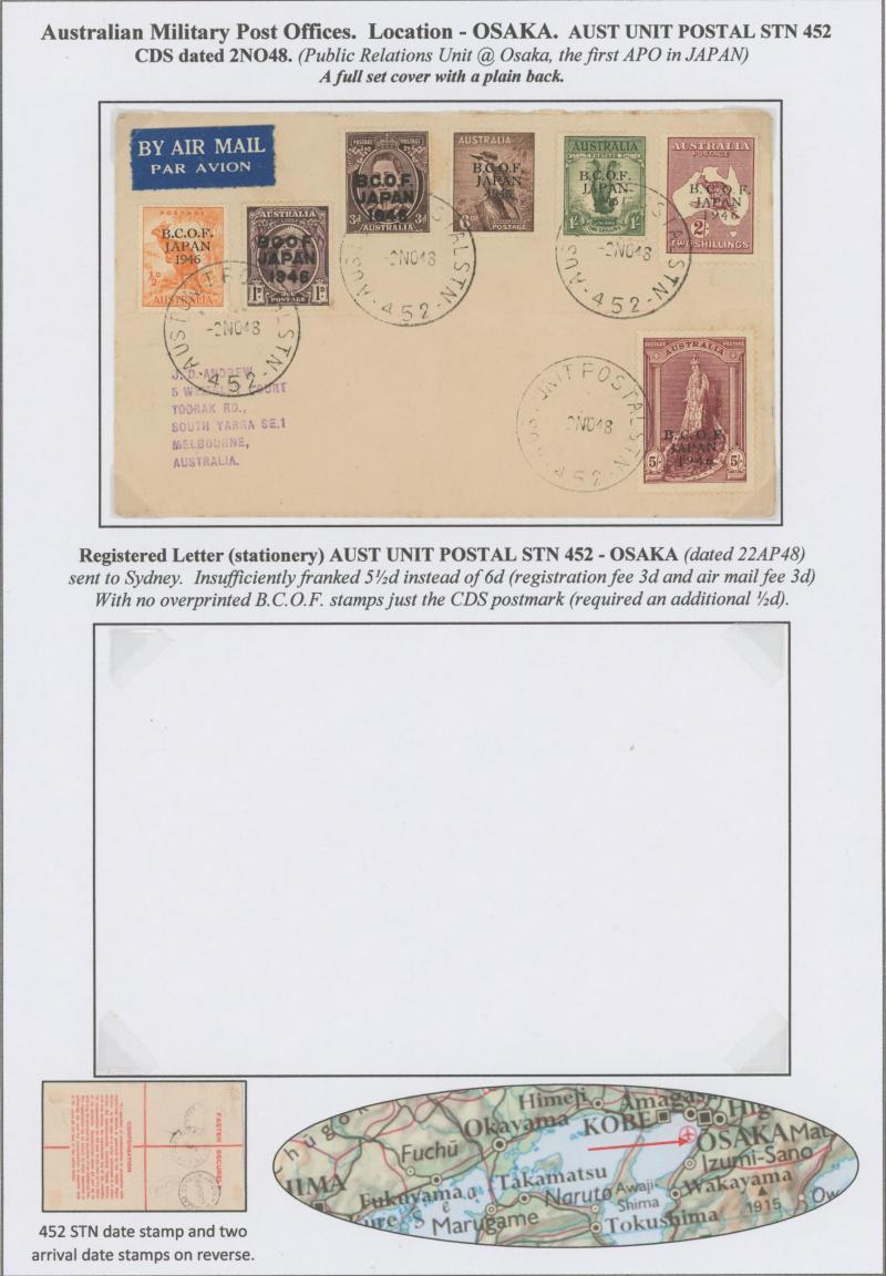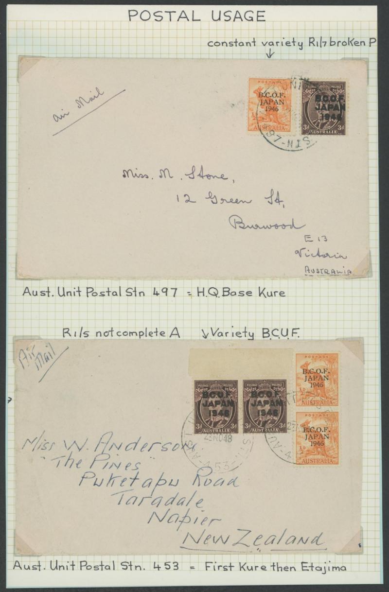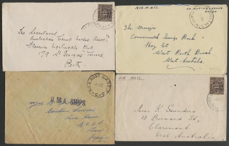 Postal history group comprising 1949 airmail to WA with BCOF 3d tied by 'AUST UNIT POSTAL STN/495' cds used at Tokyo, four later