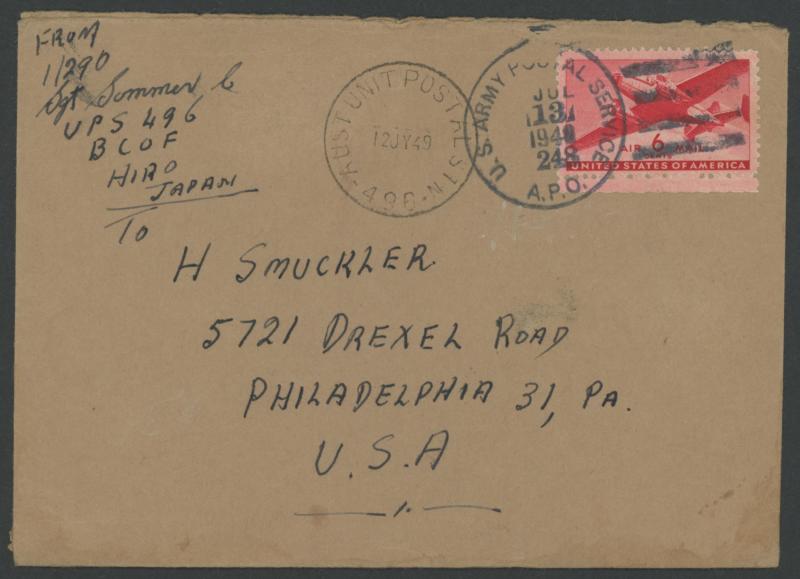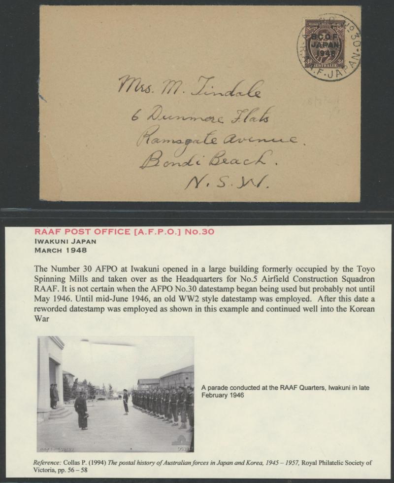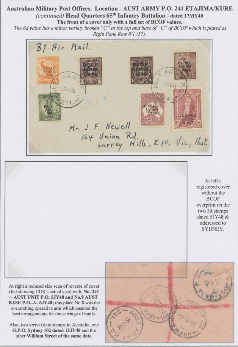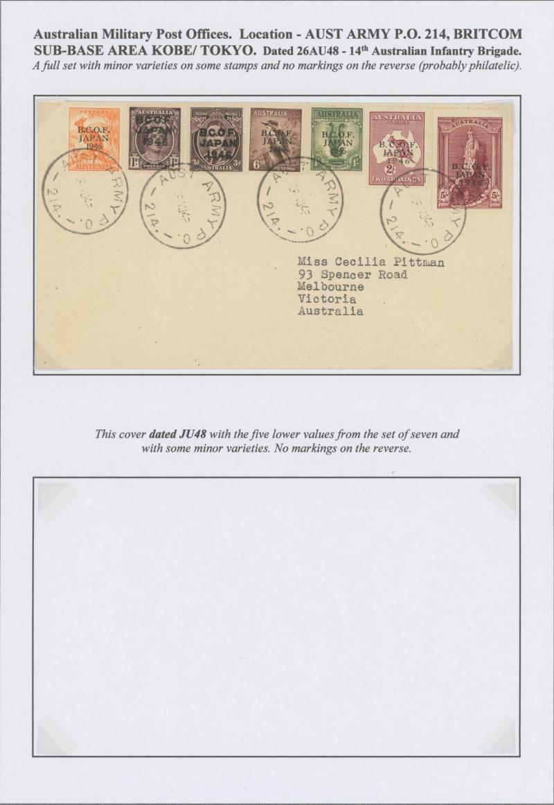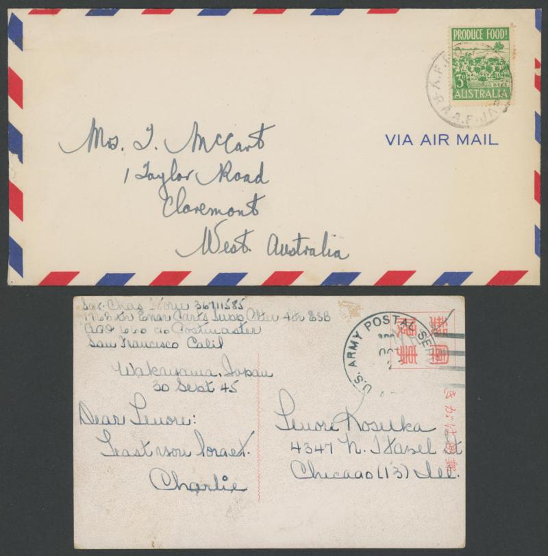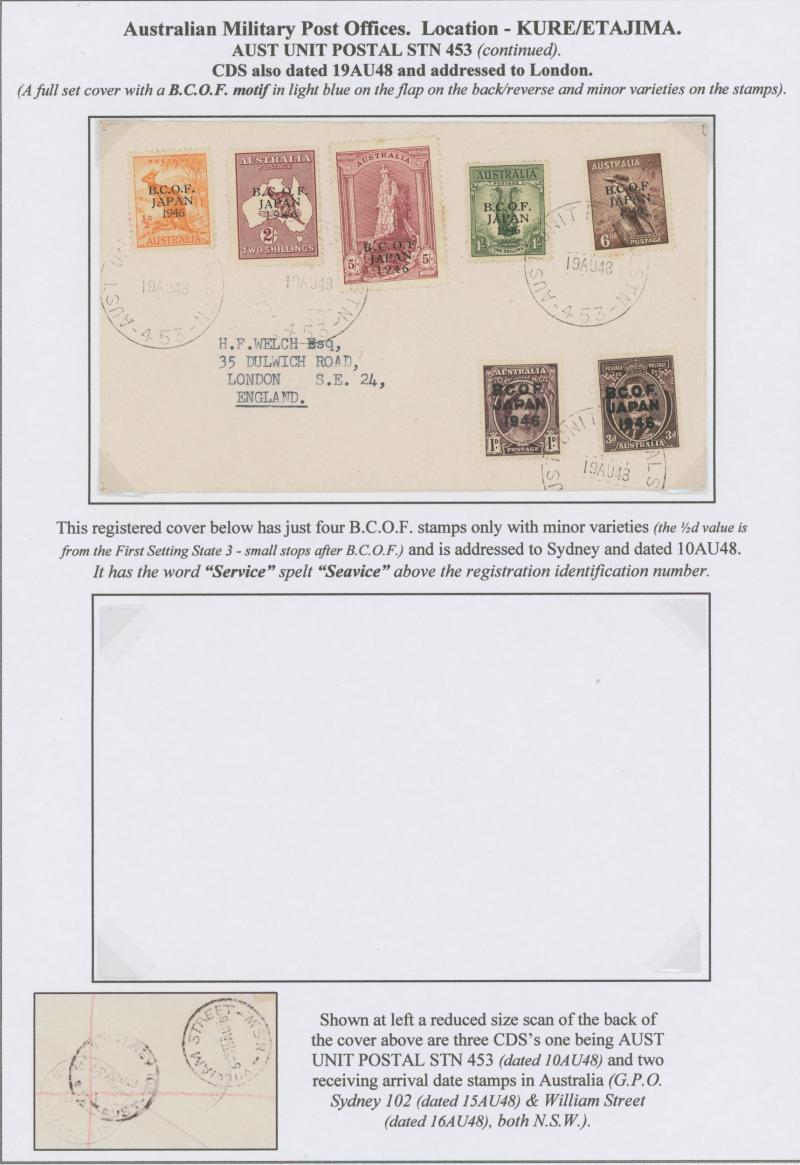 Postal history group comprising 1949 airmail to WA with BCOF 3d tied by 'AUST UNIT POSTAL STN/495' cds used at Tokyo, four later