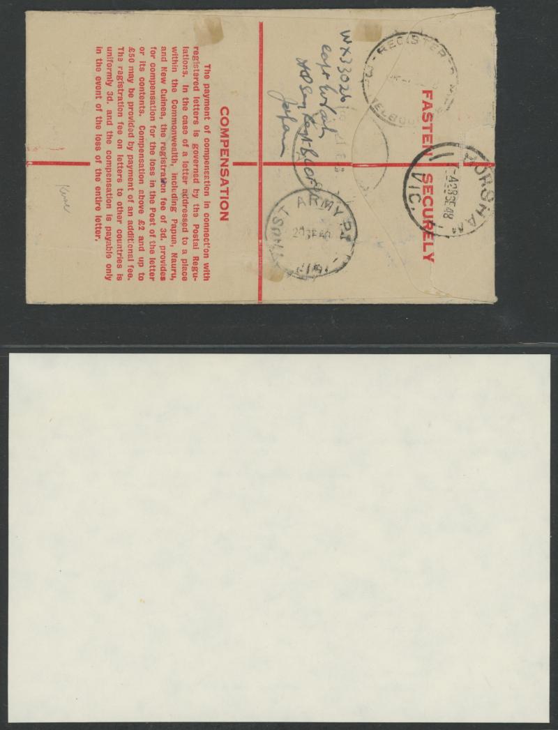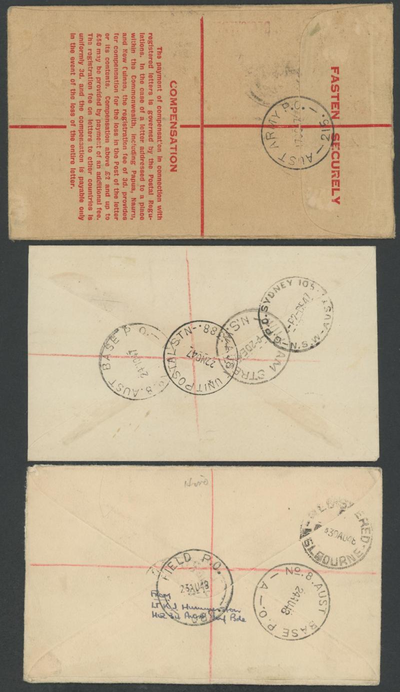 Envelope by 'AUST ARMY PO/17OC47/ 215. ', plain registered envelope with another set - the 6d with Antique Font '6' (Cat $425; £325 for used) - tied by 'FIELD PO/23AU48/ 080. ' cds, plain unaddressed envelope with set to 5/- Thin Paper tied by 'AUST