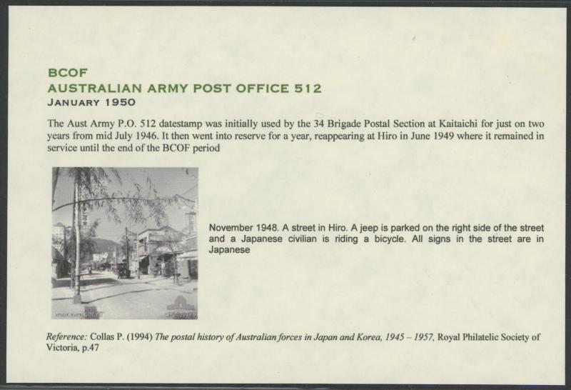 Hiro, also American Forces x5 including postcard, Business Reply and official mail, and Korean War x4, etc, generally fine to very fine. Also '... Australian Forces in Japan & Korea' by Phil Collas (1994).