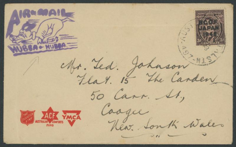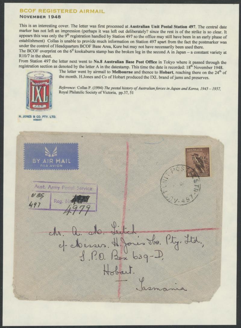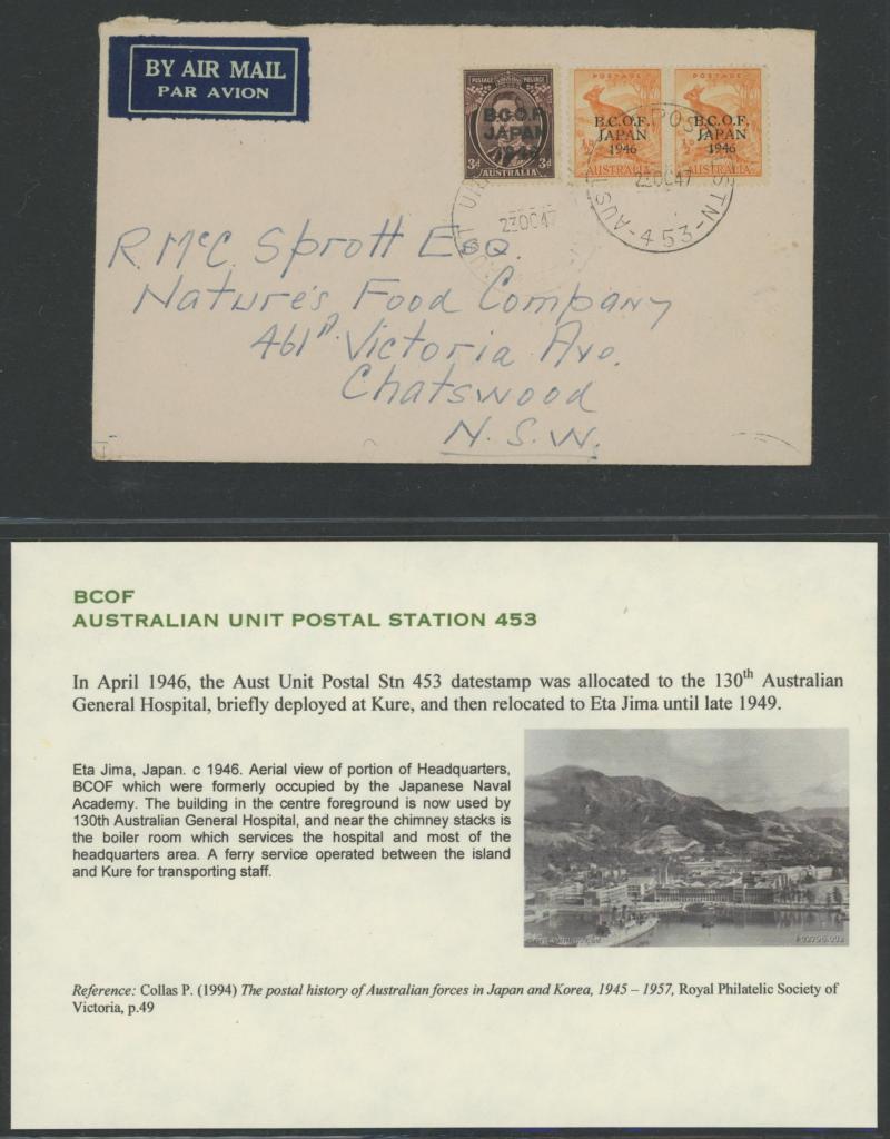 UNIT POSTAL STN/11NO48/ 345 ' cds, 1947 registered cover with 'AUST UNIT POSTAL STN/22NO47/ 388. ' cds used at Nijimura (civilian settlement for Forces' wives and 'BCOF Brats'), 1947 Qantas flights Sydney-Japan and Japan-Sydney with the appropriate