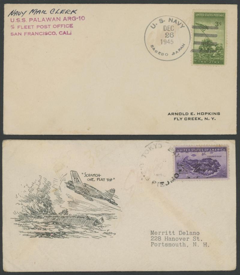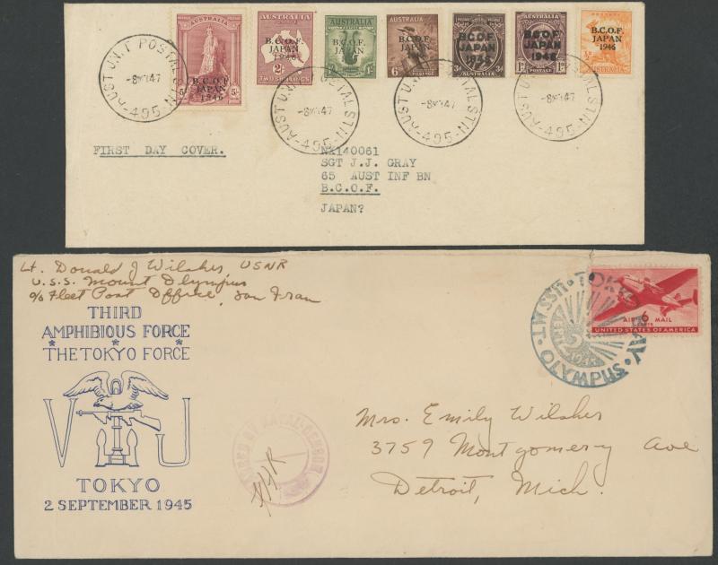 labels, 1948 BOAC First Flight to GB with BCOF/GB combination franking, set to 1/- tied by Indian-pattern cds to cover to "Kai-Tak/Hong Kong", etc, also US Forces x5 including with superb 'TOKYO BAY/SEPT 2 1945/USS MT OLYMPUS' woodcut cancel,