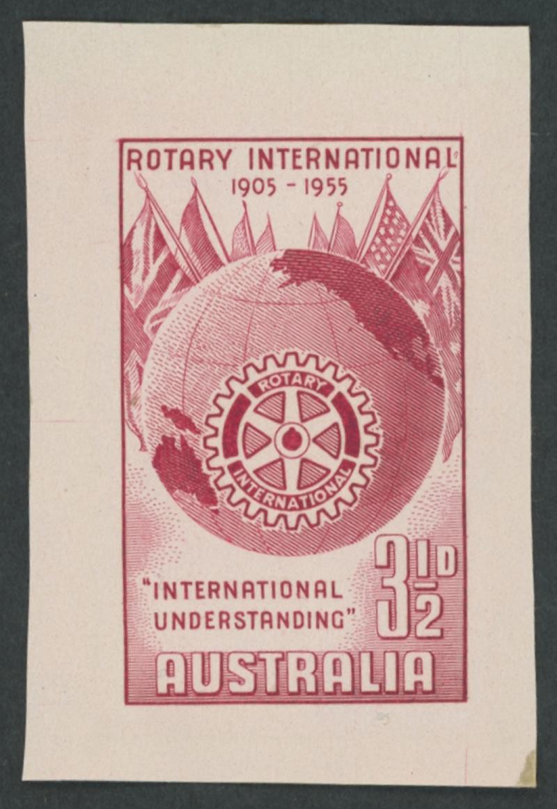 1955 Rotary Anniversary 3½d die proof in carmine - the issued colour - on wove paper (31x46mm) removed from the presentation mount