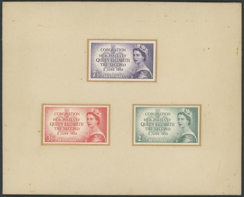 1953 Coronation 3½d 7½d & 2/- SG 264-266 set of three imperforate die proofs in the issued colours recessed in a single card