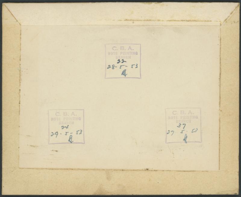 (145x115mm) ACSC 300/1/2DP(1), three Note Printing Branch handstamps on the reverse each dated "28-5-53" and numbered "22", "24" & "37" respecitvely, a few minor blemishes on the card and the paper flap missing, the proofs are very fine, Cat $7500.