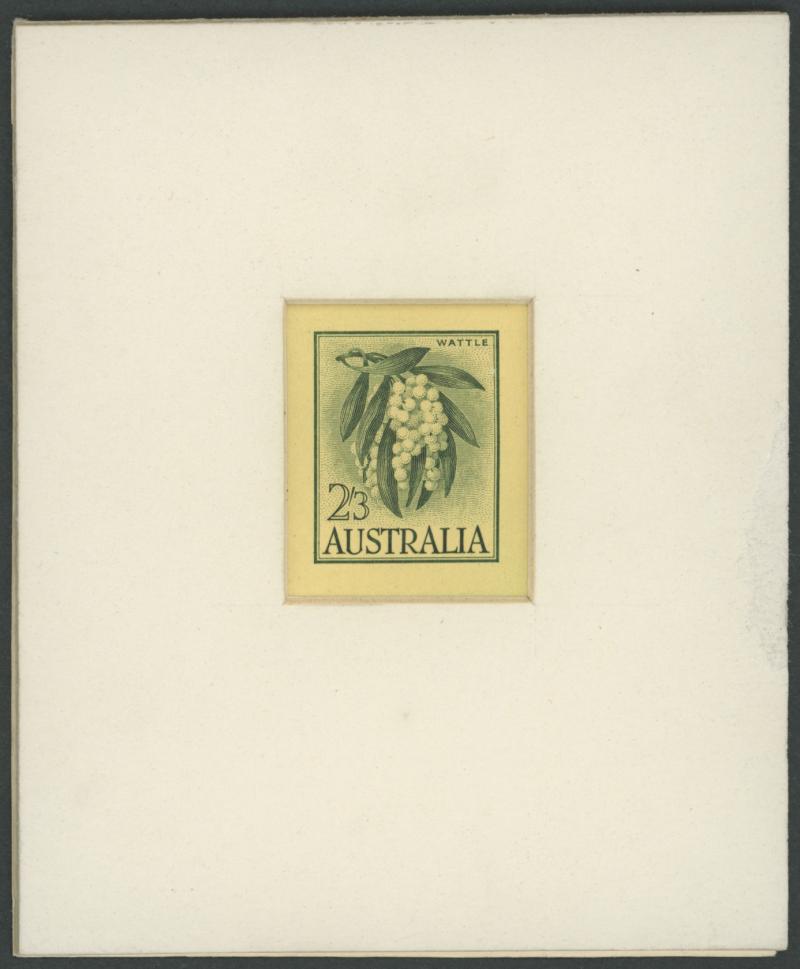 1959-65 Flowers 2/3d Wattle SG 324 imperforate die proof in the issued colour on bright yellow paper recessed in a card (85x95mm)