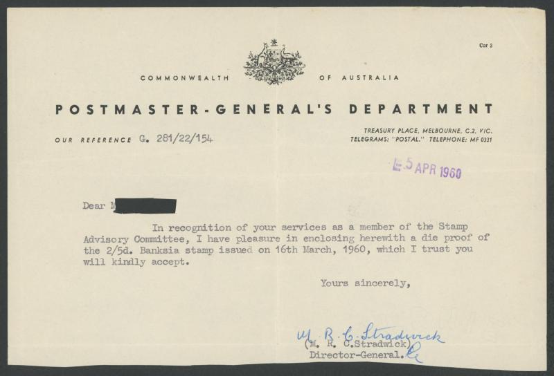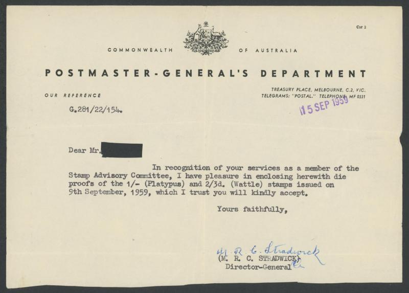 collector. The ACSC states that nine such proofs were prepared, of which one is in the Royal Collection (un-numbered). The recipient of this proof was JRW Purves of the Stamp Advisory Committee, with the PMG's Department letter enclosing the proof