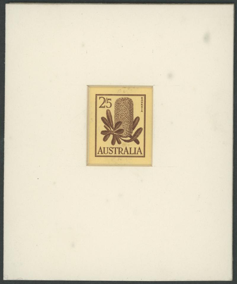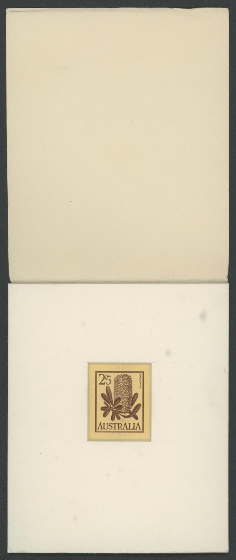 1959-65 Flowers 2/5d Banksia SG 325 imperforate die proof in the issued colour on yellow paper recessed in a card (85x95mm) ACSC