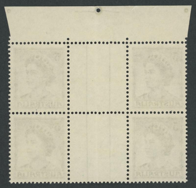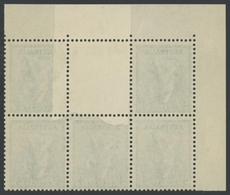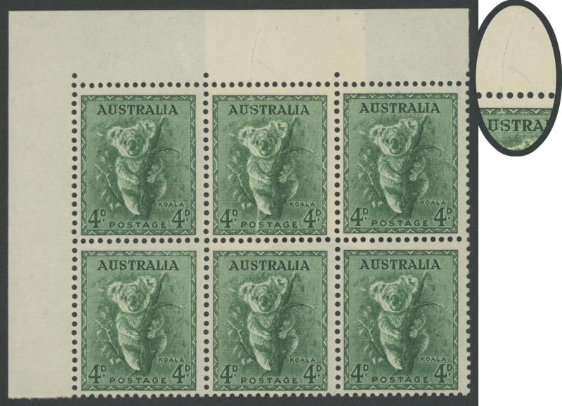 1948-56 Definitives No Watermark 4d Koala SG 230a block of 6 (3x2) from top left hand corner of sheet showing Post Office Repair