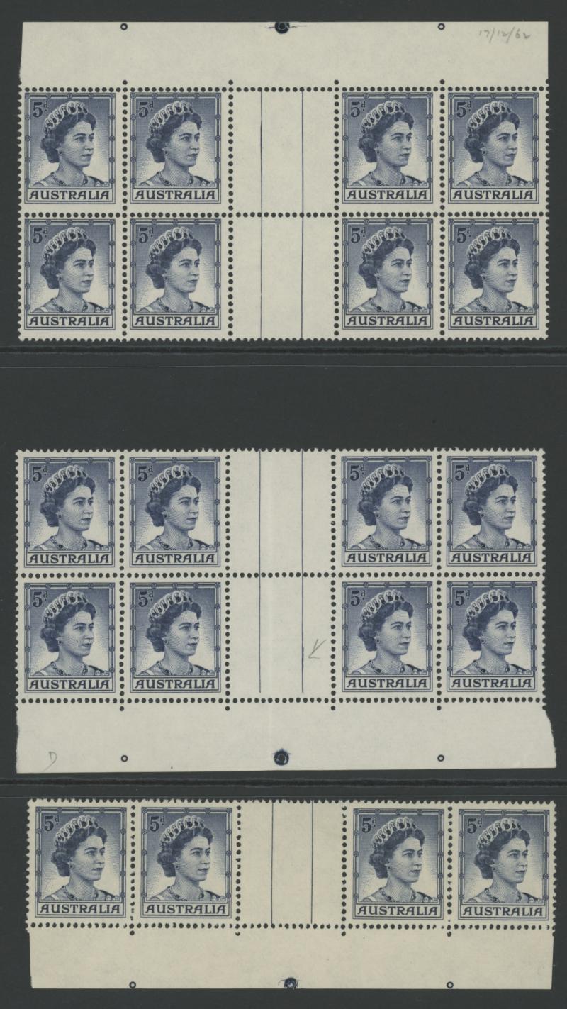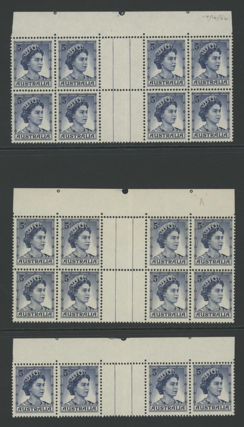 1959-63 QEII Definitives 5d blue SG 314 range of blocks with Cracked Plate Pip Fractures, comprising Electro A 'I' normal state