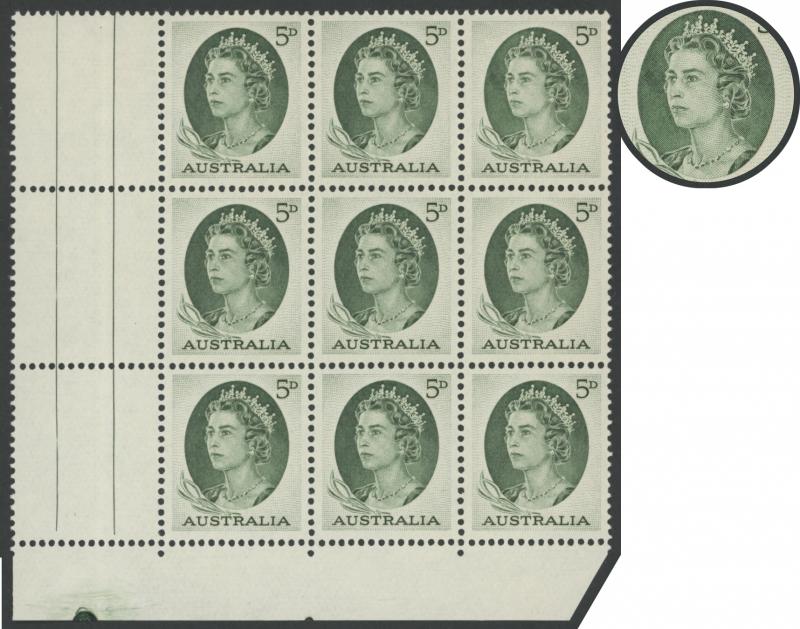 1959-64 Definitives 5d green Ordinary Paper SG 354 block of 9, [Pos C R8/3] with Retouched Cross-Hatching of Oval Opposite Queen's