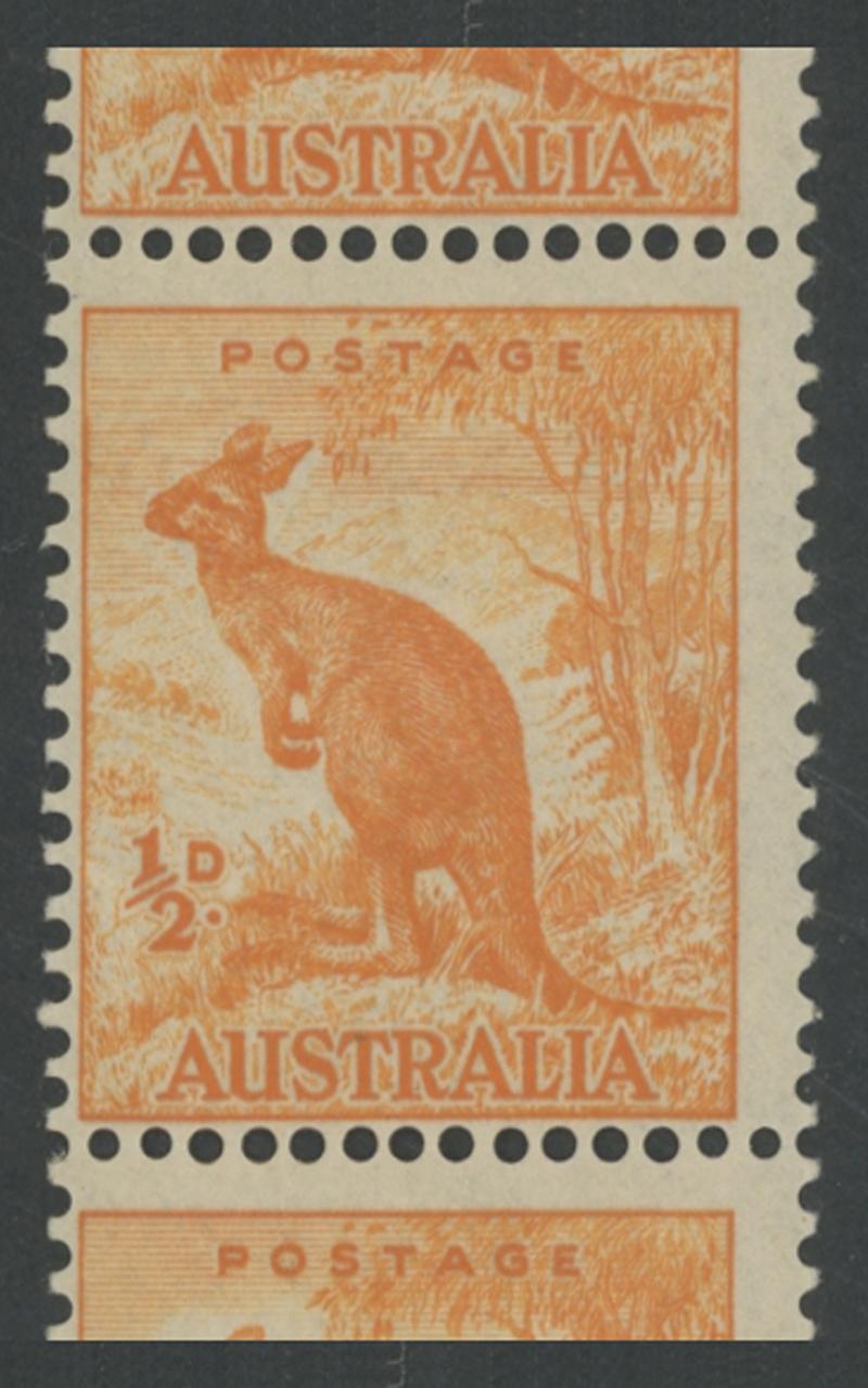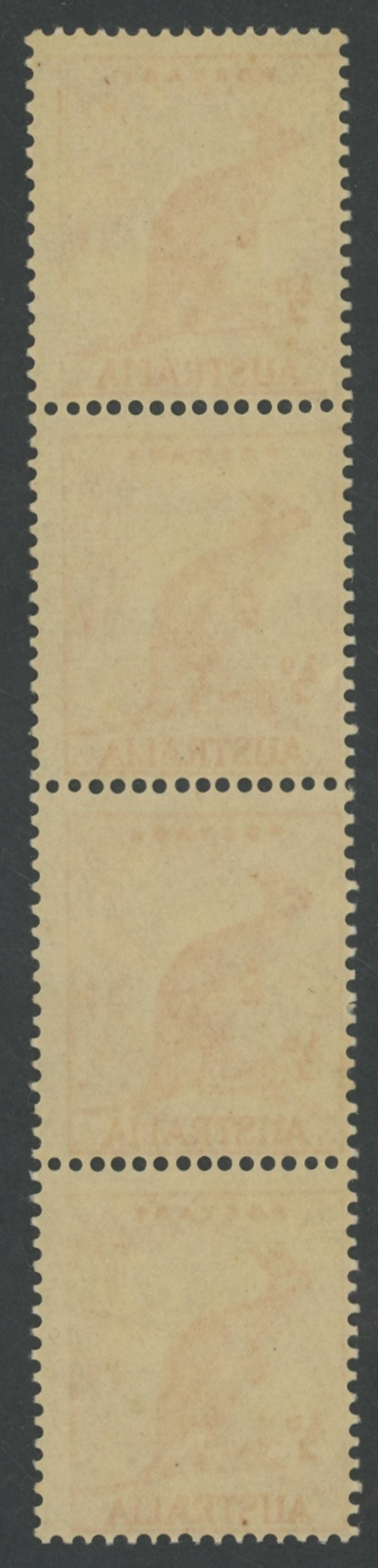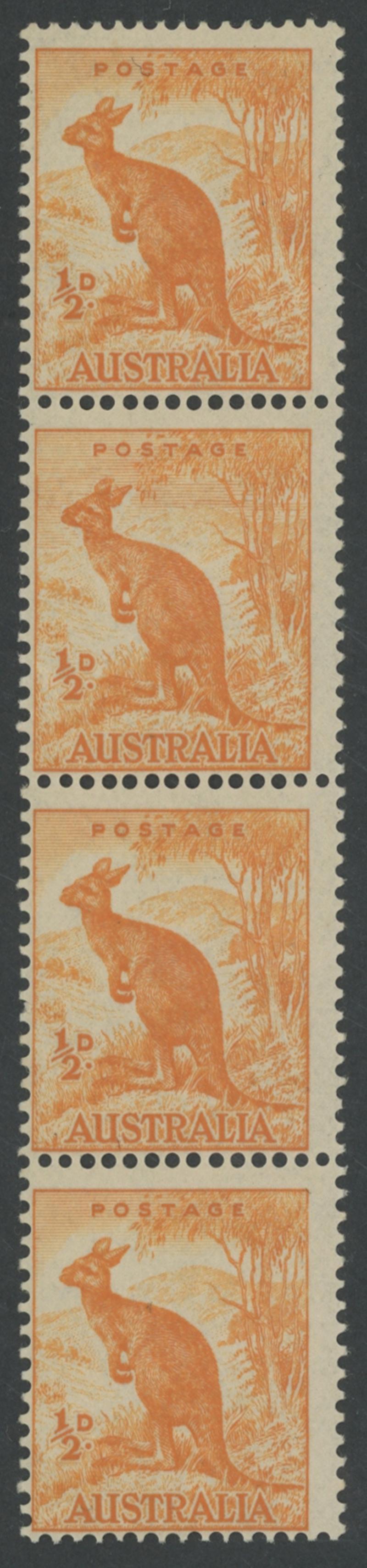 1948-56 Definitives No Watermark ½d Kangaroo coil strip of 4 ACSC 180bh, the second unit with the Major Foggy Hills Retouch 180ga