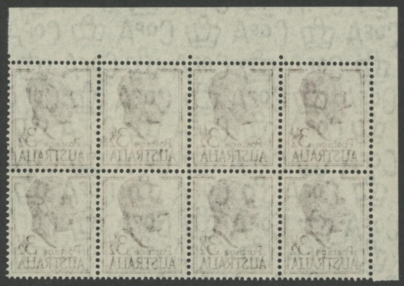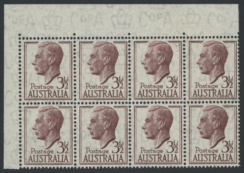 1951-1953 Definitives KGVI 3½d brown-purple SG 247 Thin Paper ACSC 253a upper-left corner block of 8 (4x2), unmounted, Cat $1000. (Image1) (Image2)