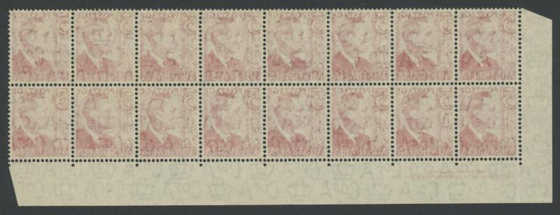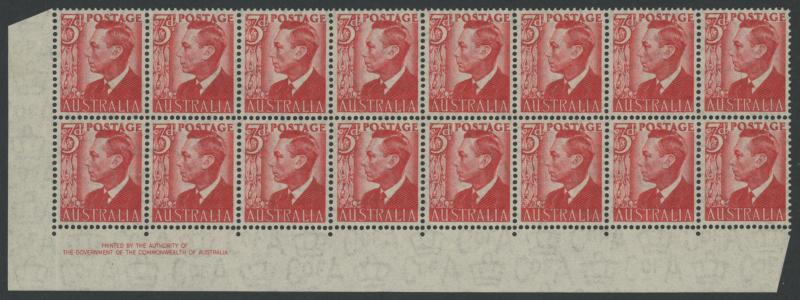 1951-1953 Definitives KGVI 3d scarlet SG 235 Thin Paper Imprint block of 16 (8x2), ACSC 251azj, unmounted and fresh, Cat $1600+ for