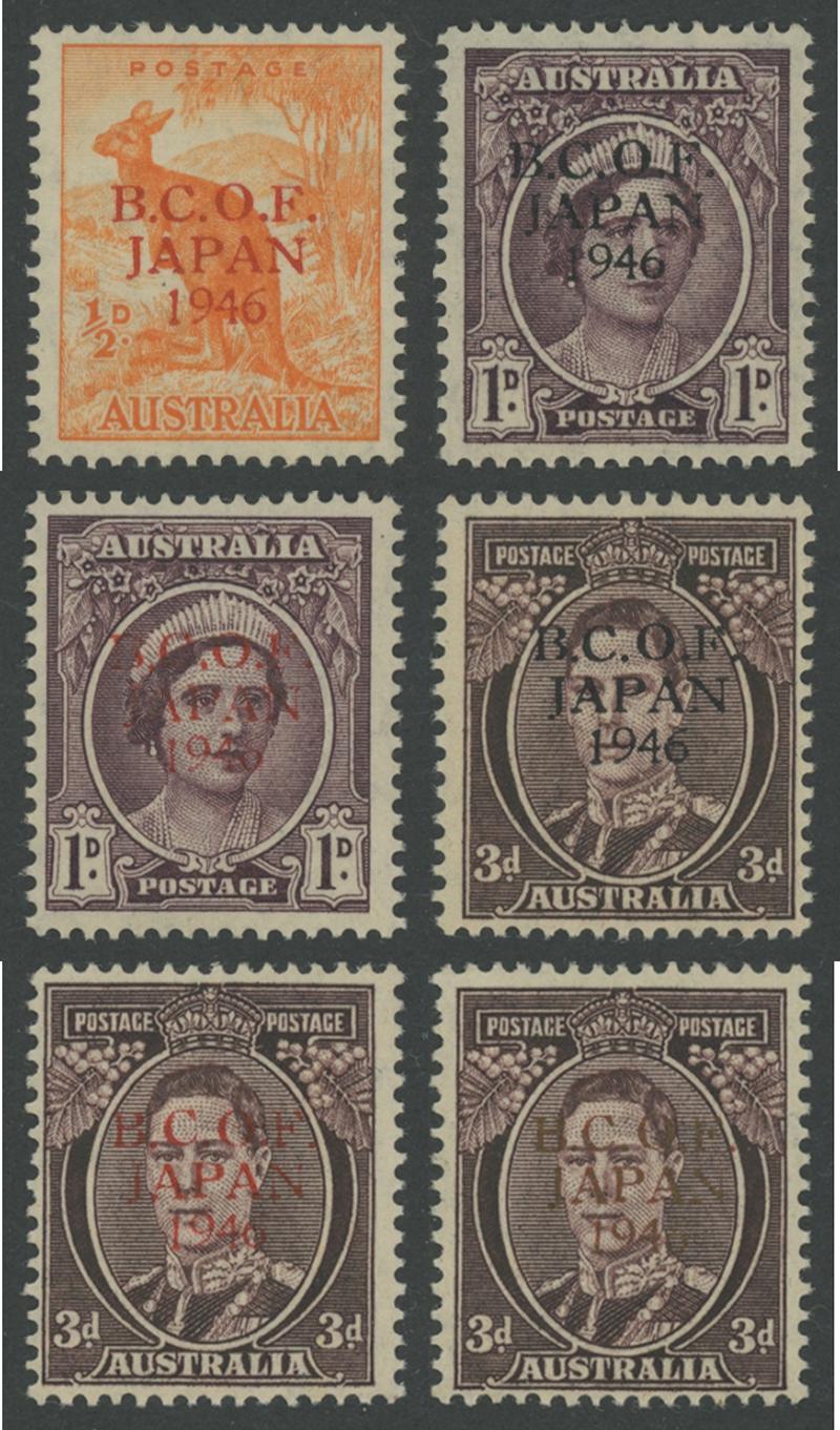 1513 P imageTYPE ONE (THIN OVERPRINT) ON STAMPS: ½d in Red, 1d in Black, 1d in Red, 3d in Black, 3d in Red and 3d in Gold ACSC J1PP(1)A-J3PP(2)C, characteristic variable centring, tied to separate pieces by 'AUST ARMY PO/18OC46/ 241. ' cds in use at BCOF HQ at Kure, Cat $4500 (£1600 for unmounted mint in a footnote below SG J7a; unpriced used). Another unusual opportunity. (6) (Image1)