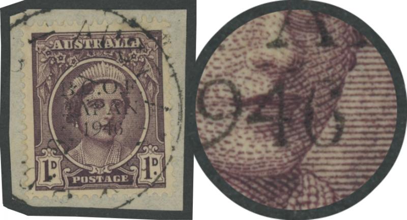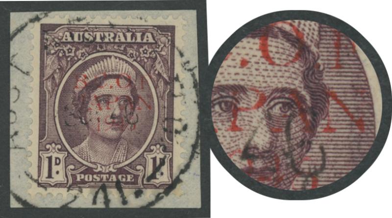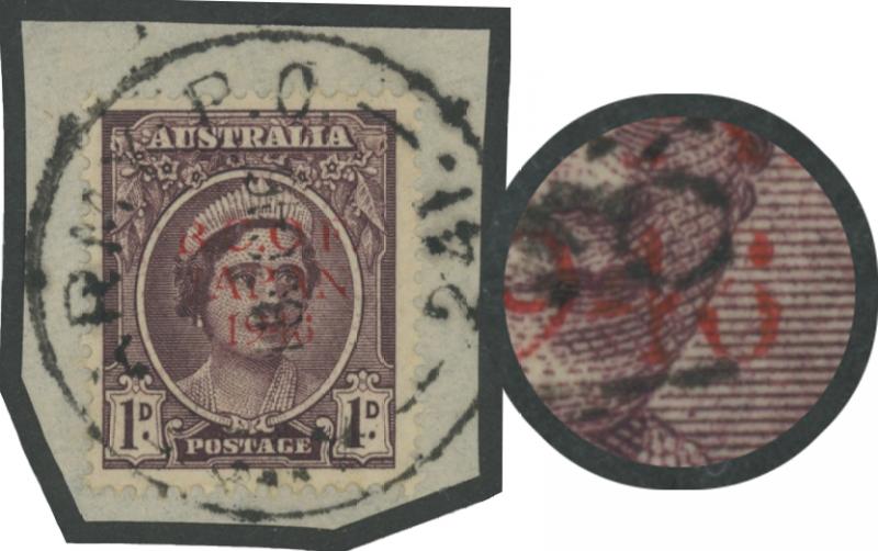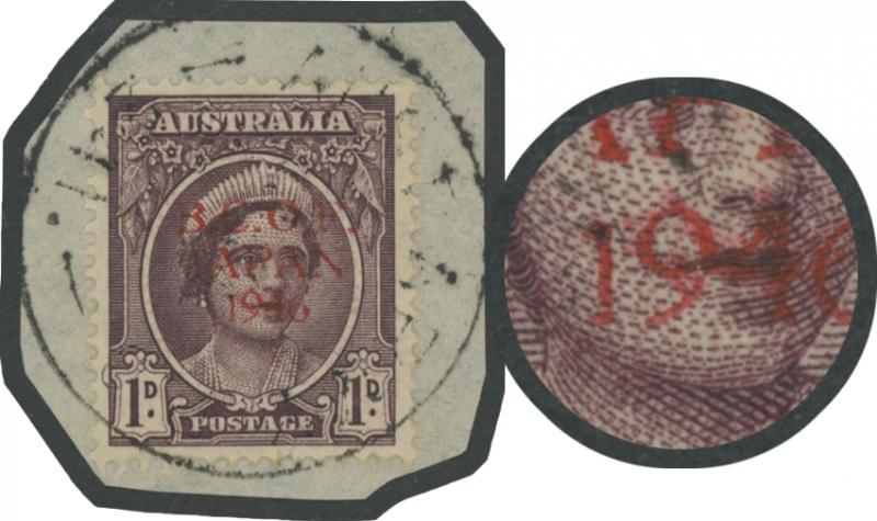 1524 P imagePENNY WITH OVERPRINT IN RED: 1d in Red with unlisted Broken Right-Hand Upright of 'N' ACSC J2PP(2)B tied to small piece by 'AUST ARMY PO/ 241. ' cds used at BCOF HQ at Kure, Cat $750. (Image1)