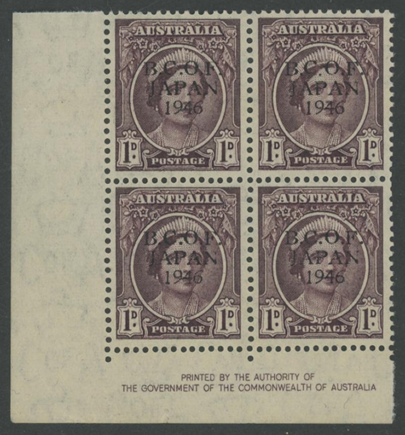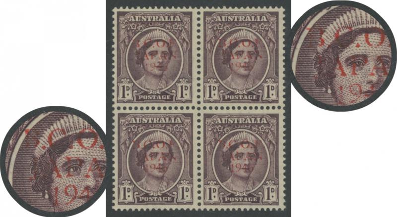 1522 P imagePENNY WITH OVERPRINT IN BLACK: 1d in Black with '1' in Wrong Font ACSC J2PP(2)Ai being the lower-right unit in a part-imprint block of 4, unusually well-centred, unmounted, Cat $1400+ for unmounted normal singles. (Image1) (Image2)