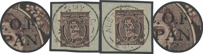 1528 P imageTHREEPENCE WITH OVERPRINT IN BLACK: 3d in Black ACSC J3PP(2)A two examples with unlisted varieties Missing Serif on 'F' and Broken Right-Hand Upright on 'N', tied to small pieces by 'AUST ARMY PO/ 241. ' cds used at BCOF HQ at Kure, Cat $1500+. (2) (Image1)