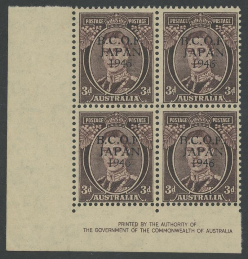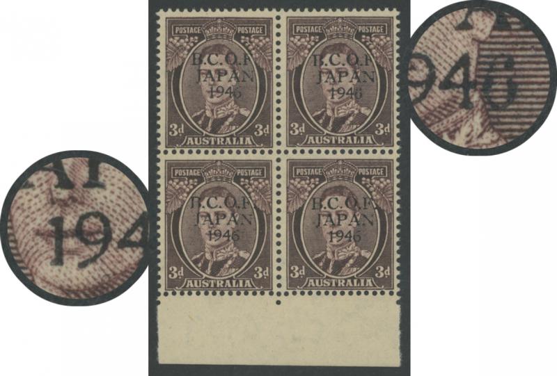 1529 P imageTHREEPENCE WITH OVERPRINT IN BLACK: 3d in Black ACSC with '6' in Wrong (Antique) Font ACSC J2PP(3)Ah being the upper-right unit in a marginal block of 4 of 4 from the base of the sheet, also with '1' in Wrong Font J2PP(3)Ai being the lower-left unit, unmounted, Cat $1200+ for unmounted normal singles (Image1) (Image2)