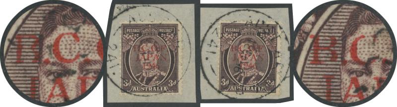THREEPENCE WITH OVERPRINT IN BLACK: 3d in Red ACSC J3PP(2)A two examples with unlisted varieties Broken 'B' and Broken 'C', tied to