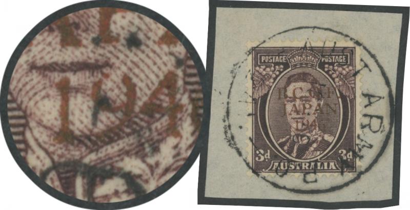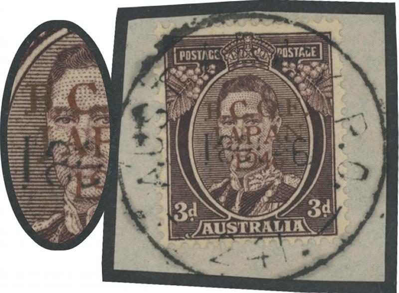 THREEPENCE WITH OVERPRINT IN 'GOLD': 3d in 'Gold' ACSC J3PP(2)C, tied to small piece by 'AUST ARMY PO/ 241. ' cds used at BCOF HQ