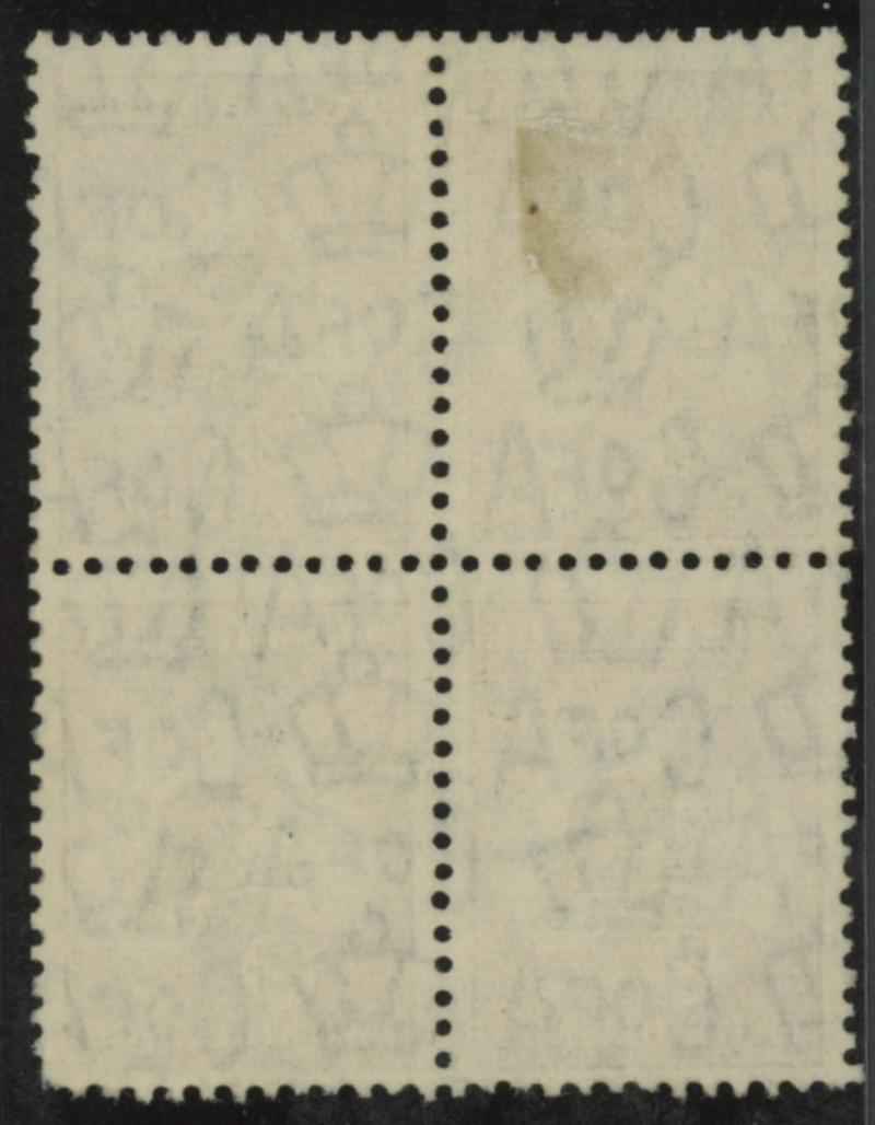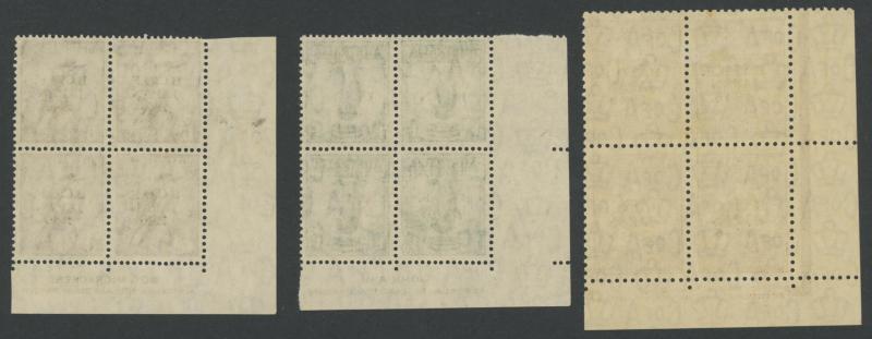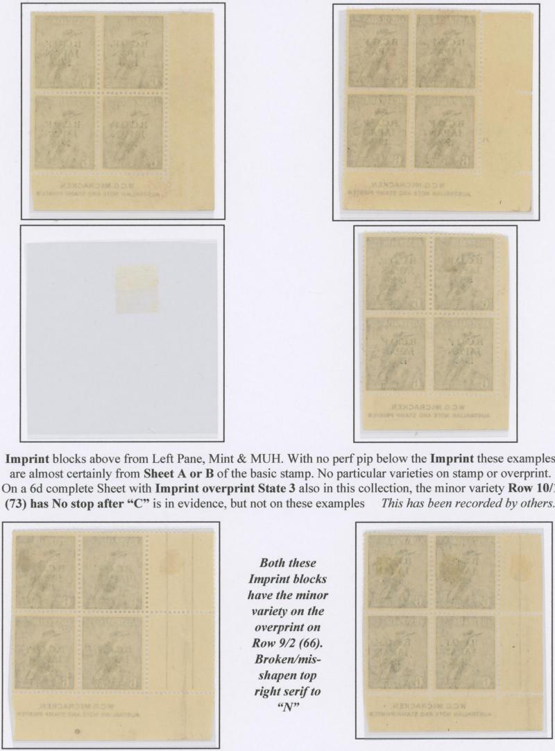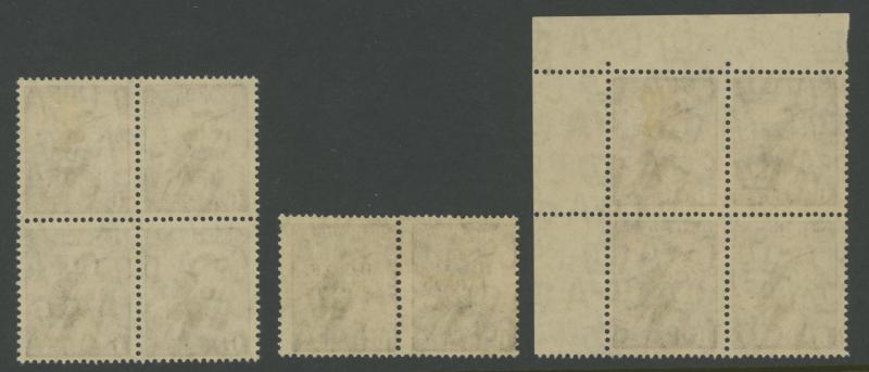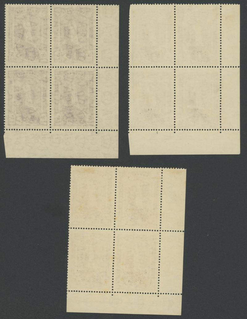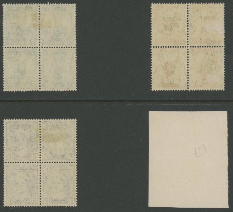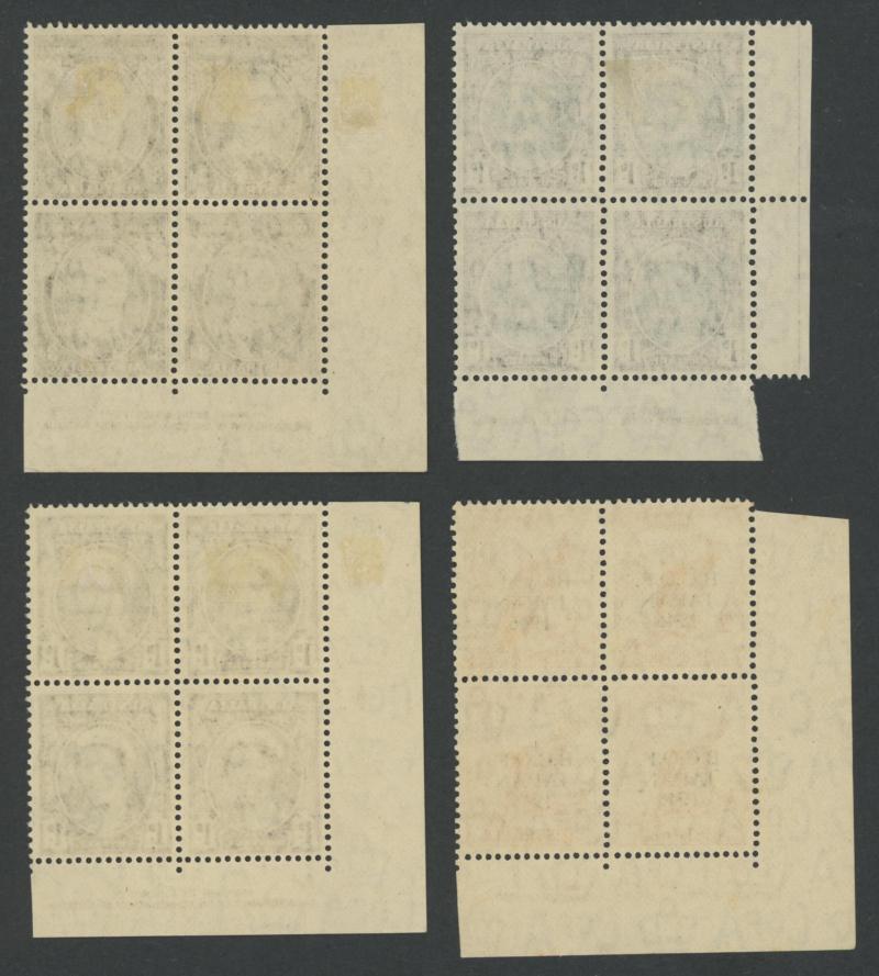 Imprint blocks of 4 comprising ½d to 5/- Thick Paper (Ash Imprint) plus 1d with Overprint in Blue-Black (small piece of corner