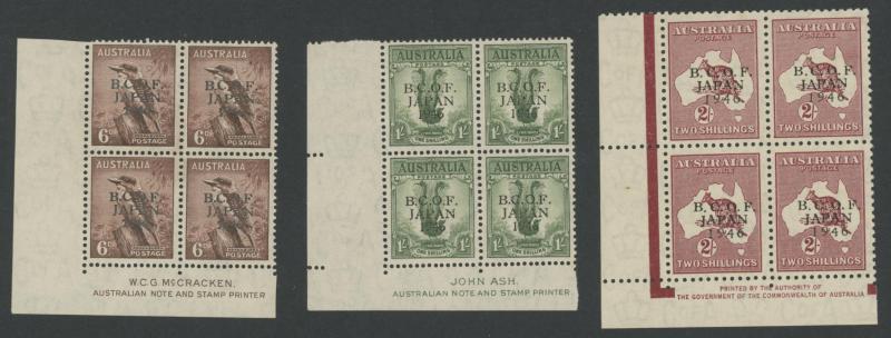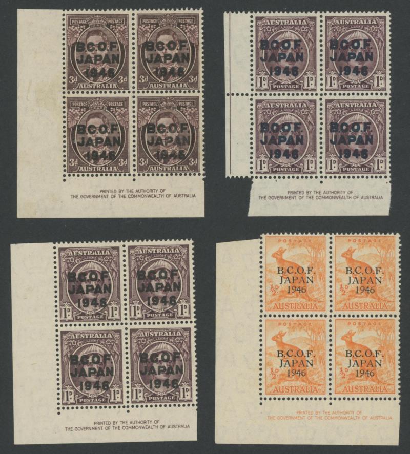 'N' in corner block of 4, Colon before 'JAPAN' (constant & should be listed) and Colon Removed both in corner blocks of 8, Wrong Font (Narrow) 'B' in block of 42 (6x7) with minor varieties on 22 units, etc, selection of imprint blocks including an