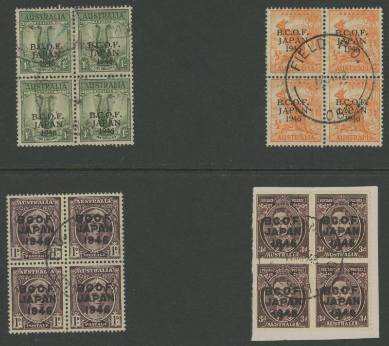 Used blocks of 4 comprising ½d 1d 3d 1/- (commercial parcel usage, blue-pencil line) and 2/- (pulled corner perf at lower-right),