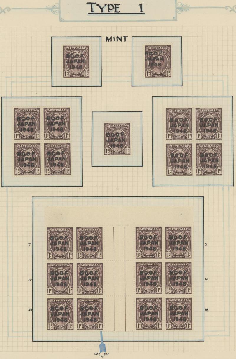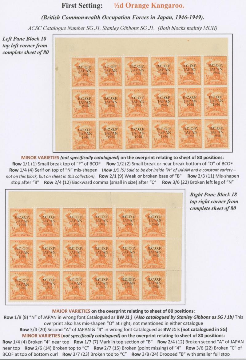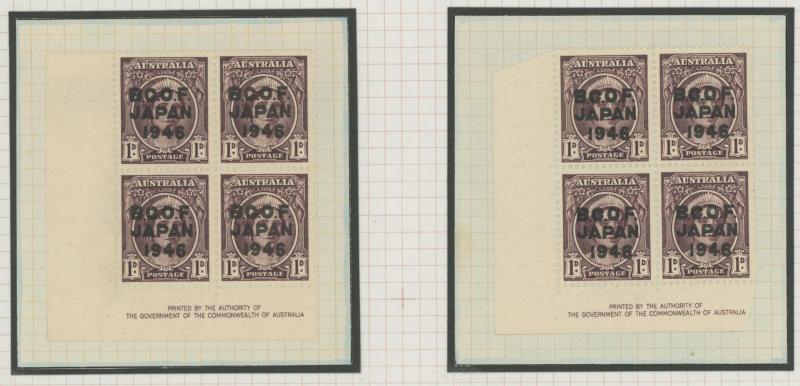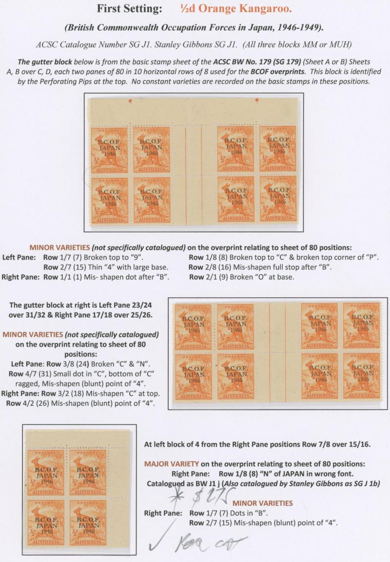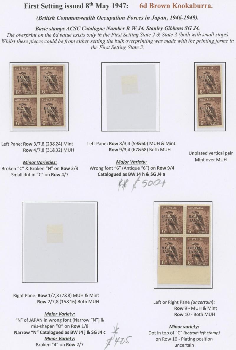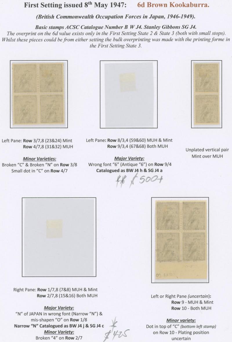 unmounted and Wrong Font (Narrow) 'N' J4j (SG J4c), mounted; and pair including Stop After 'JAPAN.' J4L (SG J4b), mounted, McCracken Imprint blocks of 4 x5 plus unmounted block of 40 (8x5) including Wrong Font (Narrow) 'B' J4m (unlisted by Gibbons)