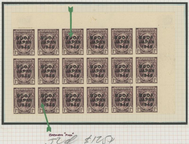 ONE PENNY: 1d annotated album and exhibit pages with Scratch across 'PAN' of 'JAPAN' in corner block of 18 (6x3) and a range of