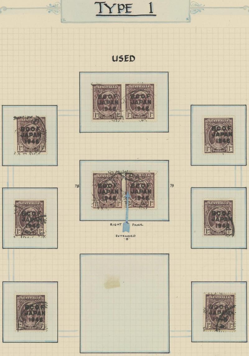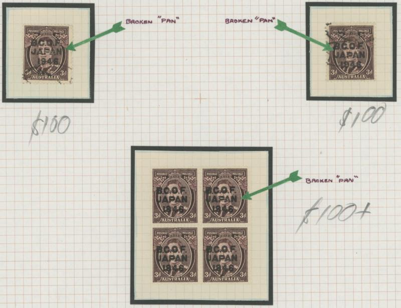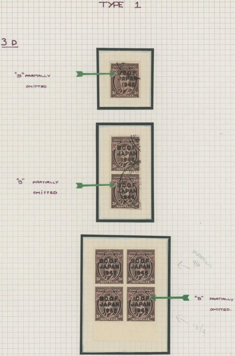 THREEPENCE: 3d annotated album and exhibit pages with Scratch across 'PAN' of 'JAPAN' x3 (one in a block of 4), B' of 'B.C.O.F.'