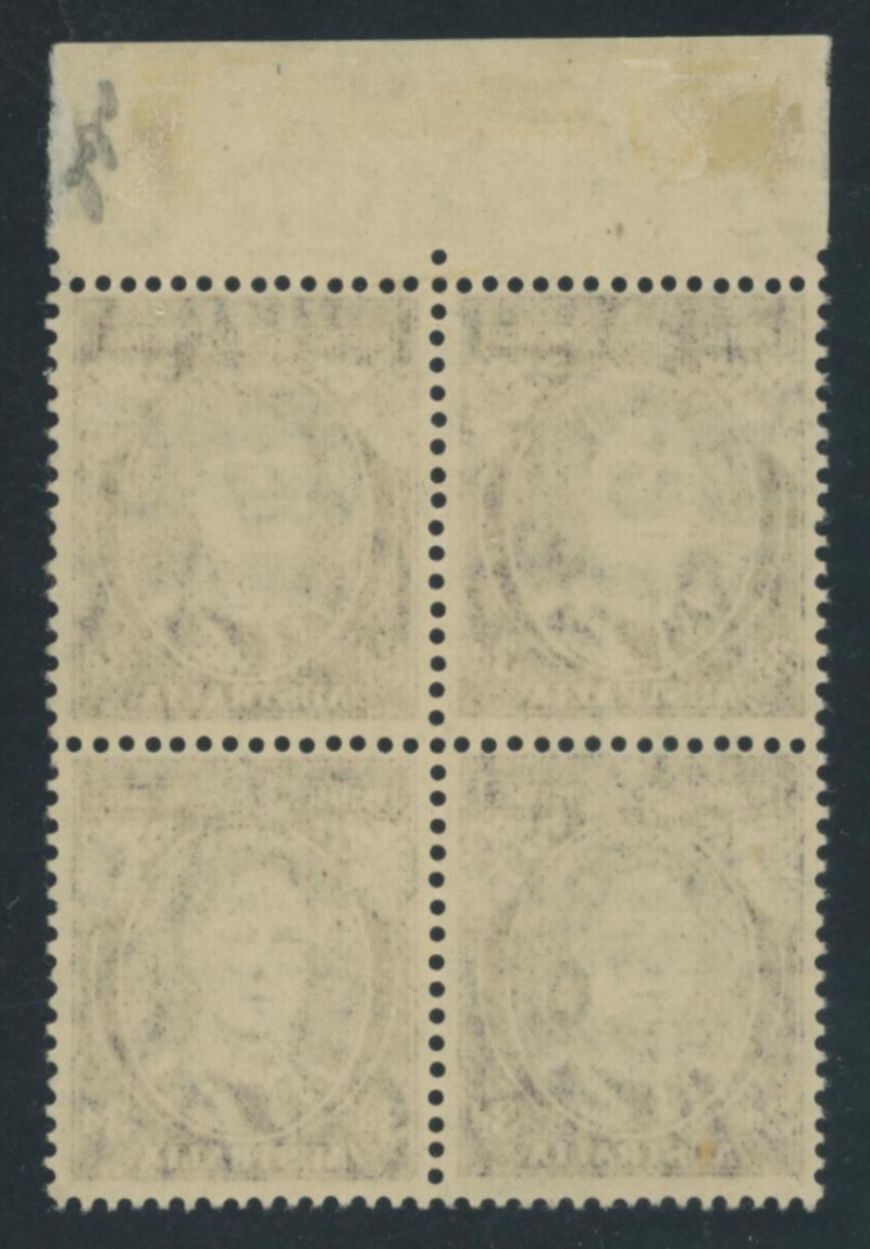 THREEPENCE: 3d Double Overprint ACSC J3ca (SG J3a) marginal block of 4 from the top of the sheet, hinge remnants in the margin