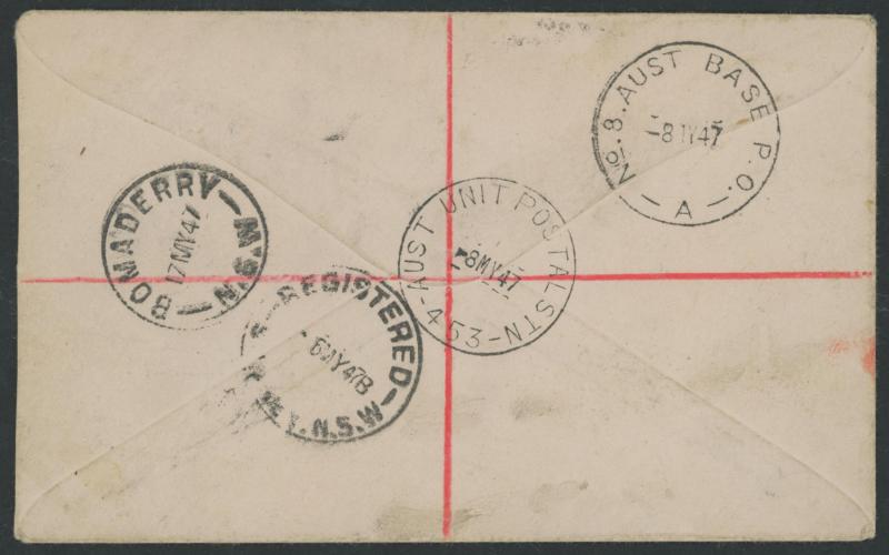 registration cachet & endorsed at top "FIRST DAY COVER", 'BOMADERRY/17MY47/NSW' arrival backstamp, very minor blemishes. Scarce registered FDC.