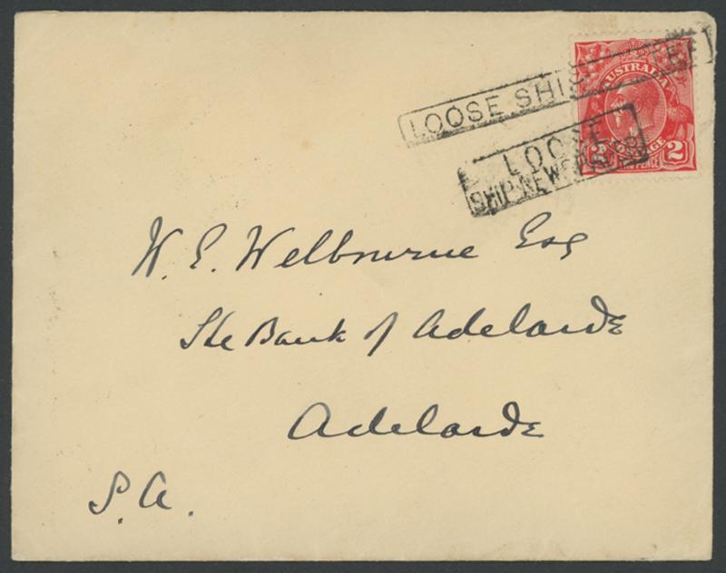 1934 commercial cover to Adelaide posted aboard ship with KGV 2d tied by boxed 'LOOSE/SHIP NEWSPAPER' handstamp in error & 'LOOSE
